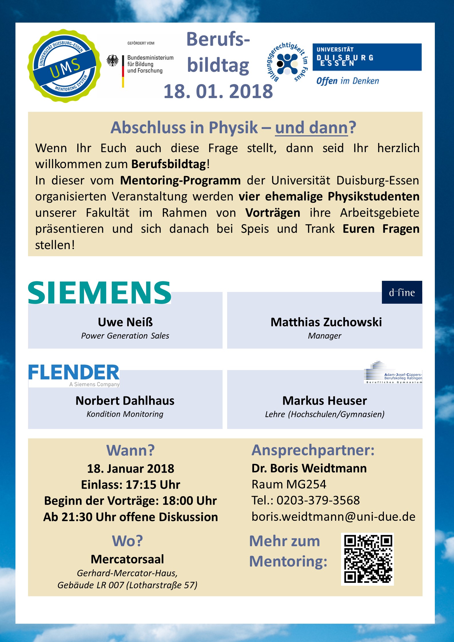Am Donnerstag, dem 18.01.2018 findet im Gerhard-Mercator-Haus ab 18:00 Uhr der Berufsbildtag statt. Dieser richtet sich an die Studierenden der Masterstudiengänge Physik und Energy Science sowie an interessierte Promovierende.