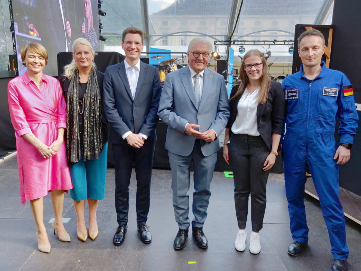 Beim diesjährigen Bürgerfest des Bundespräsidenten im Schloss Bellevue gab es nicht nur einen Livestream zur ISS sondern auch ein Podiumsdiskussion mit zwei Vertretern der beiden aktuell laufenden ISS-Überflieger-Experimente. Mit dabei Arise-Teamchef Tobias Steinpilz aus unserer Fakultät und Kira Grundwald Universiät Stuttgart. Weitere Infos zum Projekt Arise finden Sie weiter unten und auf der Arise-Twitter-Seite
