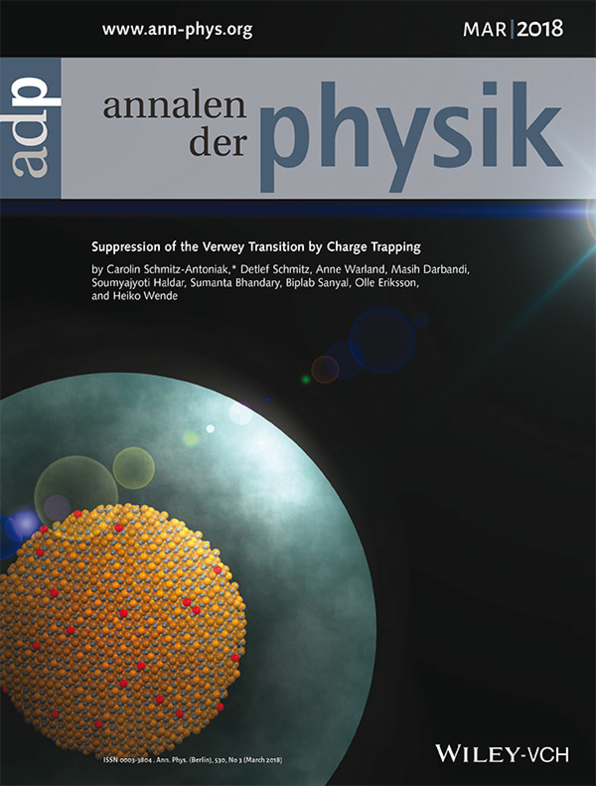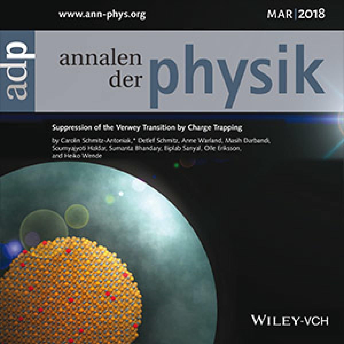 Es ist schwierig, diesen Phasenübergang in einem Ensemble aus Nanopartikeln mittels Beugungsmethoden zu charakterisieren. In einer Zusammenarbeit von Dr. Carolin Schmitz-Antoniak (FZ Jülich) mit Mitarbeitern der Arbeitsgruppe Wende und Wissenschaftlern der theoretischen Physik an der Uppsala University (Schweden) gelang es nun, den Verwey-Übergang in Nanopartikeln mittels Röntgenabsorptionsspektroskopie an der Synchrotronstrahlungsquelle BESSY-II in Berlin detailliert zu analysieren. Spannenderweise finden die Kooperationspartner, dass der Verwey-Übergang in den Magnetit-Partikeln durch eine Hülle aus Silica (siehe künstlerische Darstellung auf dem Cover der renommierten Zeitschrift „Annalen der Physik“) unterdrückt werden kann. Durch die spektroskopischen Untersuchungen konnte gezeigt werden, dass dieser Effekt durch das Einfangen (Festhalten) von Ladungen an der Grenzfläche der Silica-Hülle zu dem Eisenoxid-Nanopartikel erklärt werden kann. Möglicherweise eröffnen diese neuen Erkenntnisse der Grundlagenforschung Möglichkeiten zum Maßschneidern der Eigenschaften der Nanopartikel für neue Anwendungen, wie etwa in smarten Materialien.
