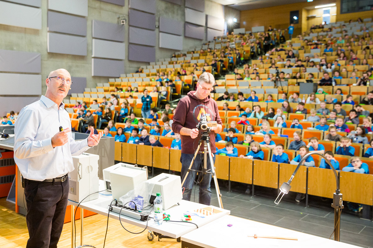 Prof. Dr. Axel Lorke ist spontan eingesprungen für Prof. Dr. Stephan Schulz, der seinen Vortrag mit dem Titel "Anorganische Chemie - Quo Vadis?" leider absagen musste. Herr Lorke hat mit seinem schier unerschöpflichen Vorrat an atemberaubenden YouTube-Filmen zur Physik inzwischen eine große Fangemeinschaft. Seit Jahren zeigt er neben seinen Klassikern auch immer wieder brandneue Clips bei der Nacht der Physik oder bei freestyle-physics.