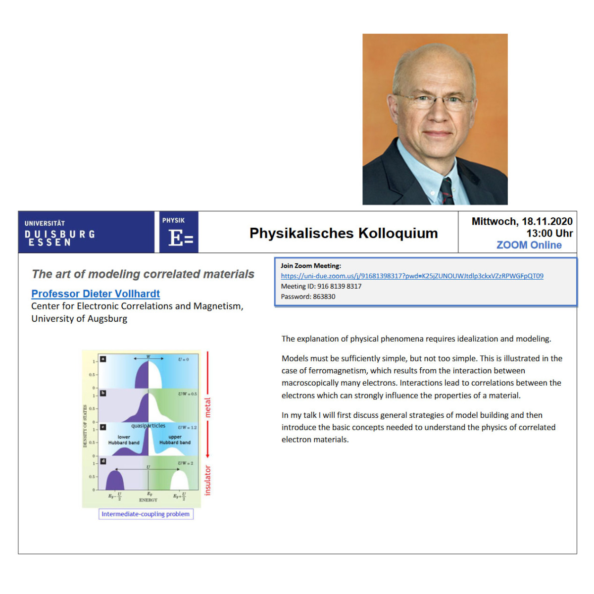Das Physikalische Kolloquium der Fakultät ist sehr erfolgreich ins Wintersemester gestartet. Mit Prof. Dr. Dieter Vollhardt startete ein sehr renommierter Physiker aus der Theoretischen Physik die Reihe von Vorträgen. 2010 ist Vollhardt die Max-Planck-Medaille, die höchste Auszeichnung der Deutschen Physikalischen Gesellschaft für Leistungen in der Theoretischen Physik, verliehen worden.