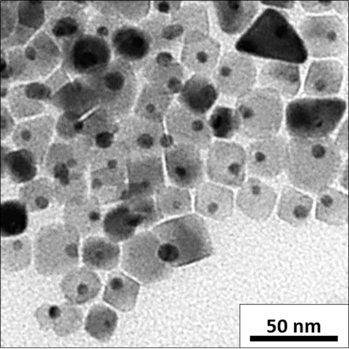 Bild: Elektronenmikroskopisches Bild von Magnetit-Gold-Nanopartikeln für die Theranostik. © Beilstein J. Nanotechnol. 2018, 9, 2684–2699