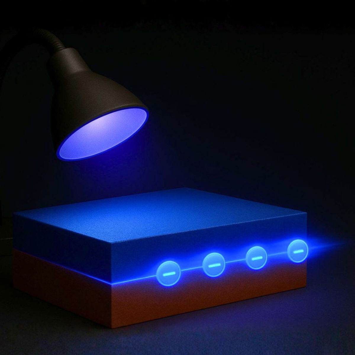 Im Bild: Licht an – Strom an: UV-Strahlung verwandelt die Grenzfläche des Materials in eine hochleitfähige Elektronenschicht (Illustration mit KI generiert).