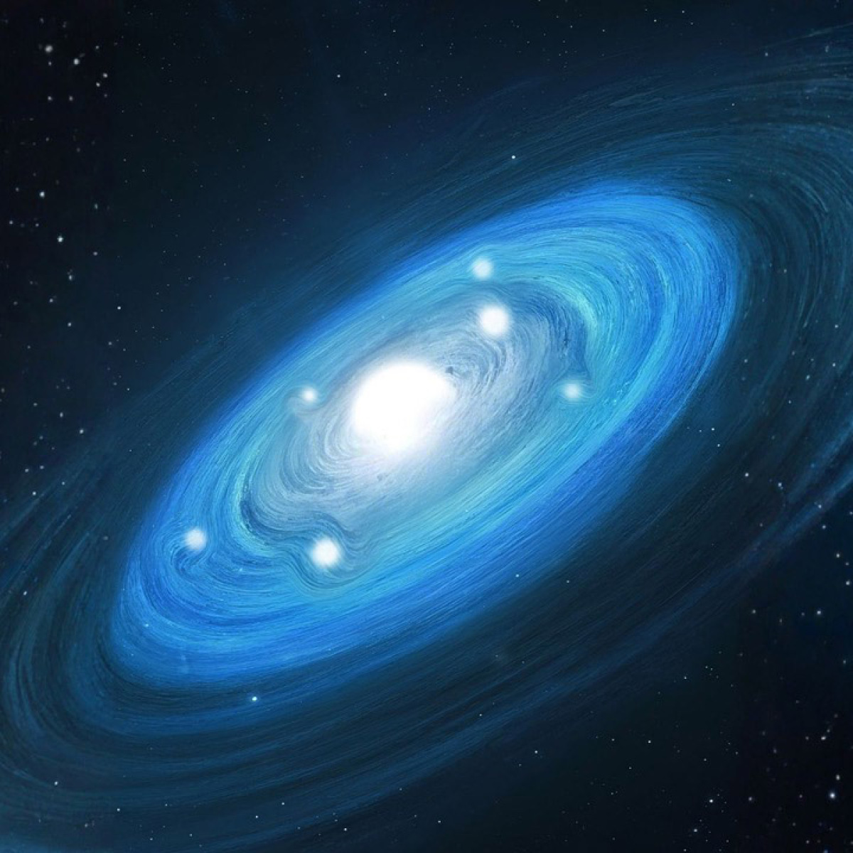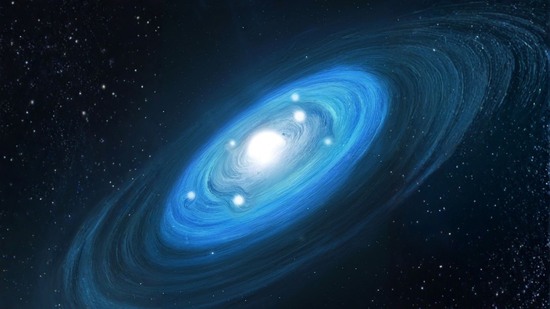 Grafik: In der rotierenden Gasscheibe haben sich sieben junge Sterne gebildet. Das außergewöhnliche System liefert neue Einblicke in die Entstehung hochkomplexer Sternsysteme.