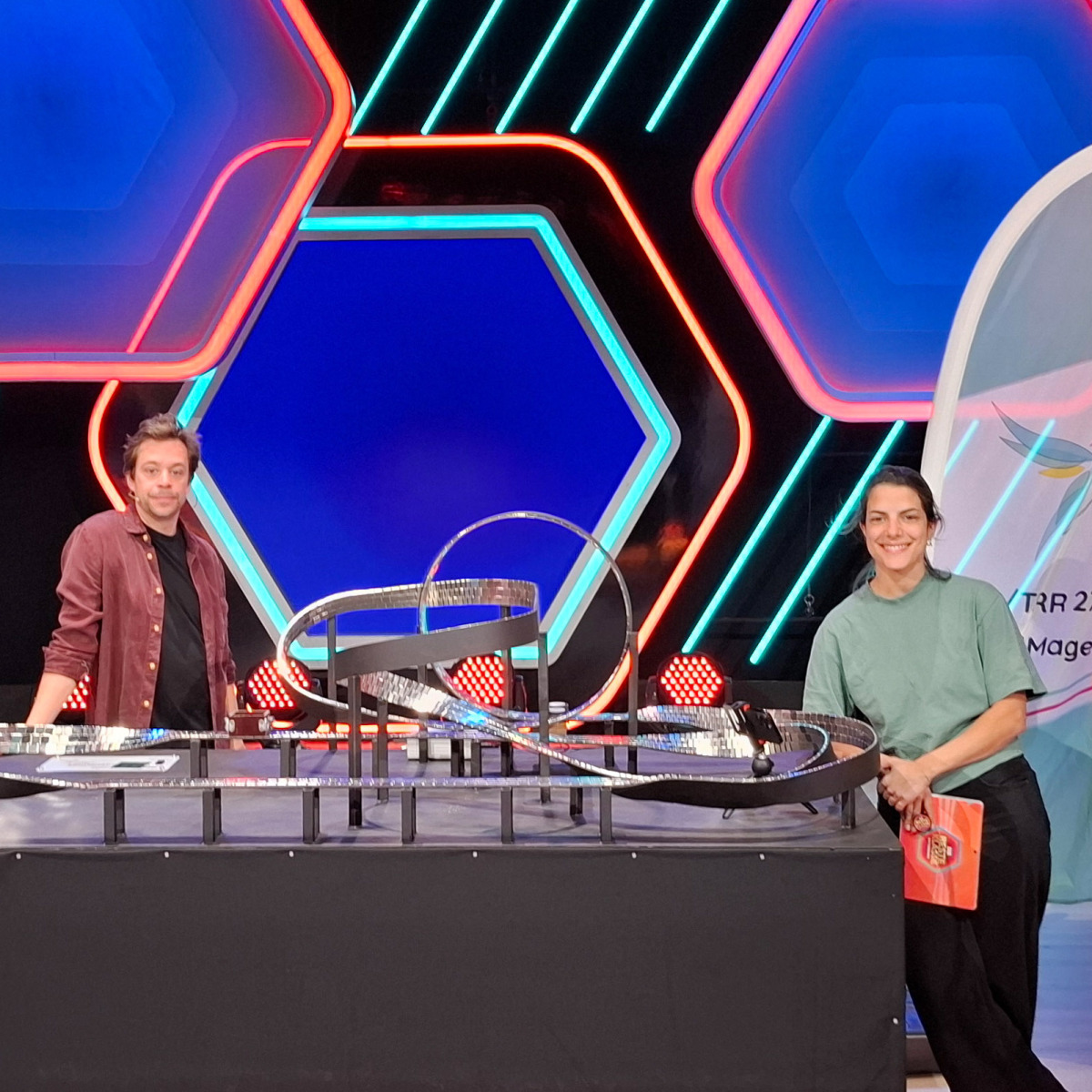 Magnetforscher von der Universität Duisburg-Essen haben das Superfinale von "Die beste Klasse Deutschlands" (11.10.2025 um 8:20 Uhr im Ersten) mit einem Experiment unterstützt. Die gezeigte Magnetschwebebahn demonstriert die Levitation von einem Supraleiter über einer Bahn aus Permanentmagneten. Das Experiment wurde im Zuge des DFG-geförderten Projekts SFB//TRR 270 HoMMage gebaut, um Forschung auch einer breiten Öffentlichkeit zu vermitteln. Dr. Nicolas Josten aus der Arbeitsgruppe von Professor Michael Farle fuhr dafür zum Studiopark KinderMedienZentrum nach Erfurt um Bavaria Entertainment bei den Dreharbeiten zur unterstützen. Die Show wird von Clarissa Corrêa da Silva und Tobias Krell moderiert und zeigt den Wettbewerb dreier Schulklassen um den Titel der besten Klasse Deutschlands.