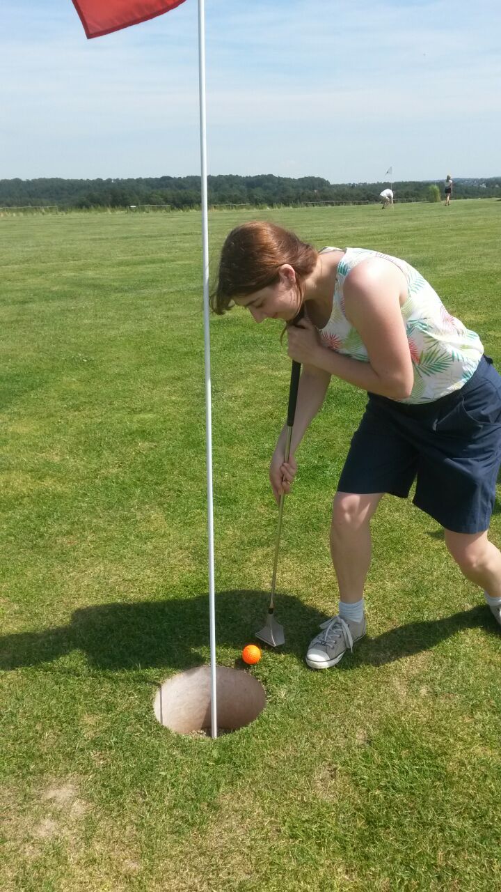 Beim diesjährigen Arbeitsgruppenausflug war trotz sengender Hitze allerhöchste Konzentration und Präzision gefragt. Denn nur mit sicherer Hand konnte der unberechenbare Ball aus riesiger Distanz (ohne störende Reflektion an der Fahnenstange) in die winzigen Löcher befördert werden. Zwar gelang dieses Mal noch kein "HIO", aber einige Bahnen wurden immerhin schon "Par" bewältigt.