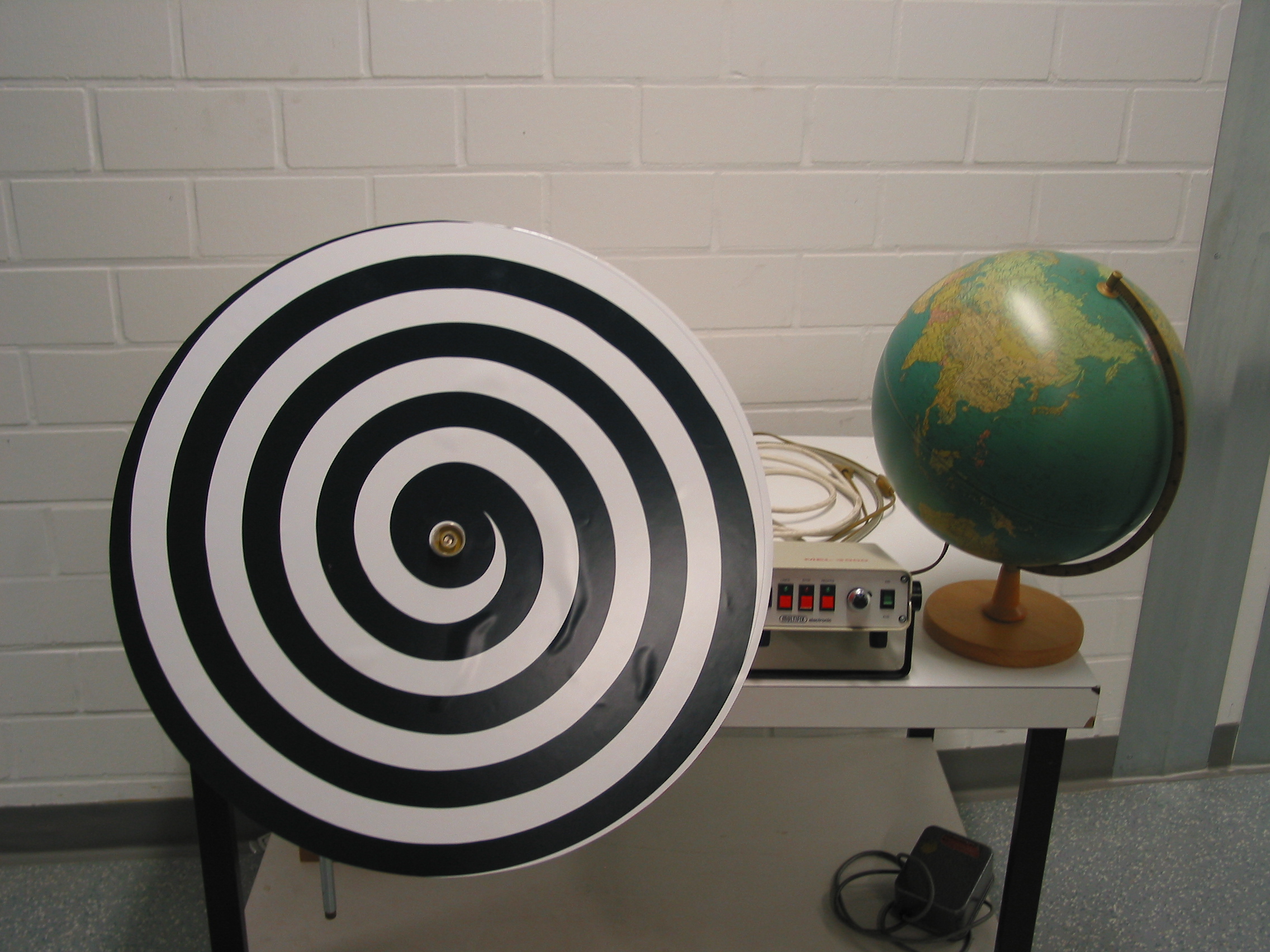 Die Größe des Objekts, beispielsweise eines Globus, scheint sich zu verändern, nachdem man die rotierende Spirale betrachtet hat. Die Drehrichtung bestimmt, ob das Objekt für den Betrachter „schrumpft“ oder „wächst“.