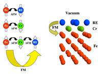 Magnetic materials with a large saturation magnetic moment are used in various applications, such as write heads in computer hard disks, electromagnetic motors, generators, and transformers. Improved and more efficient materials are continuously sought after, but, for the last 75 years, the largest room temperature saturation moment (2.45 µB per atom), as described by the maximum of the Slater-Pauling curve, has been provided by an Fe-Co alloy. Rare earth metals have a larger magnetic moment, however they are not ferromagnetically ordered at room temperature. By combining ferromagnets like Fe with a rare earth element the ordering temperature is enhanced by the magnetic coupling to Fe. Unfortunately the coupling between such metals is antiferromagnetic which in turn reduces the net magnetization. In a joint work of the group of Prof. Wende and the theory group of O. Eriksson (Uppsala) this limitation was overcome by inserting an interlayer of Cr between the ferromagnet and the rare earth metal.