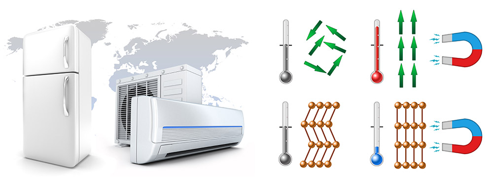 Refrigeration is one of the main sinks of the German and European electricity consumption and accordingly contributes to worldwide CO2 emissions. High reduction potentials are envisaged if caloric effects in solid materials are utilized. The recent discovery of giant entropy changes associated with ferroelastic phase transformations promises higher efficiency. Ferroic transitions enhance the entropy change of magneto-, elasto-, baro- and electro-caloric effects. Furthermore, because the refrigerant is in a solid state, the technology completely eliminates the need for high global-warming potential halofluorocarbon refrigerants.