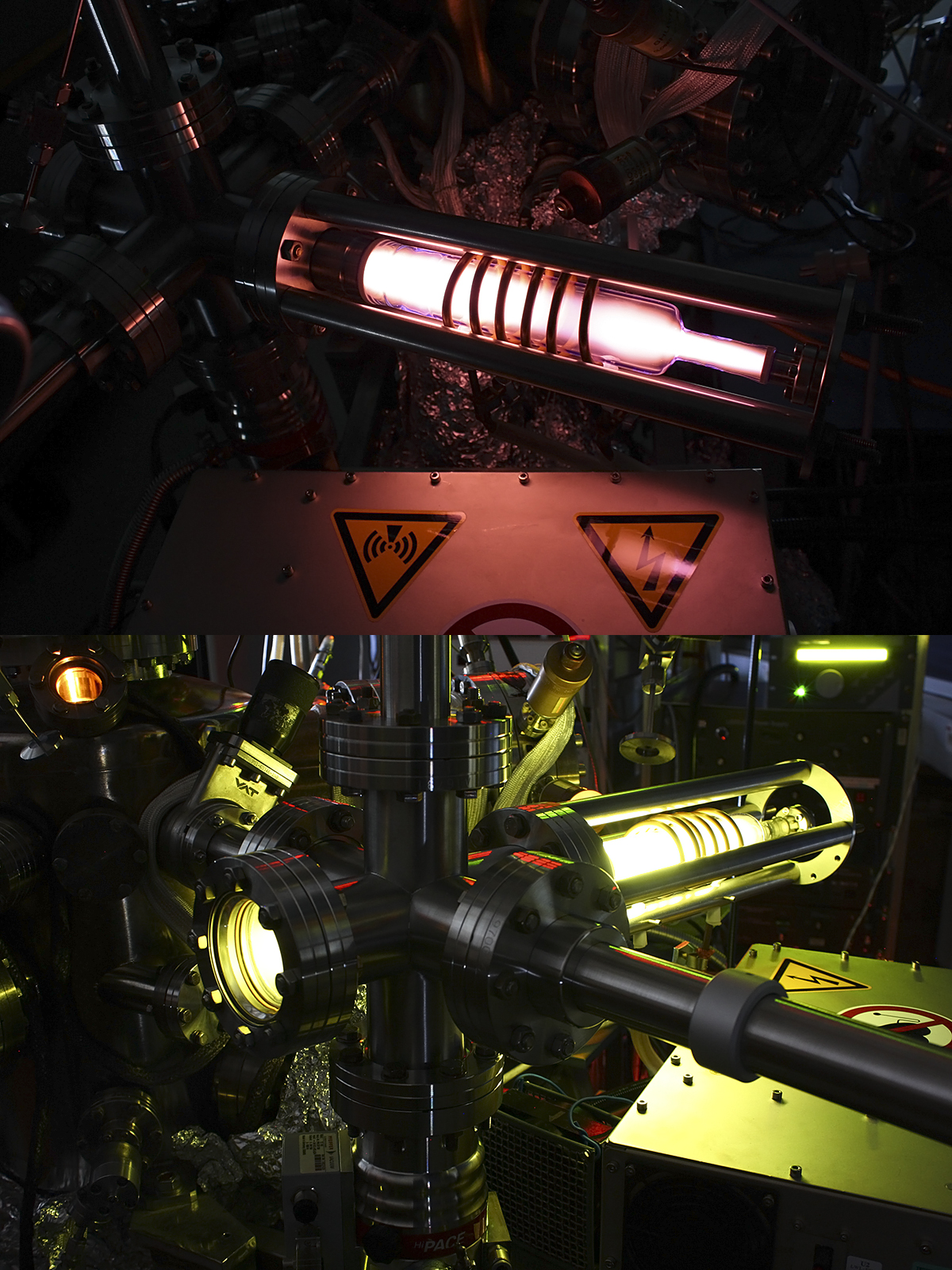 The key component of the plasma chamber is a glass recipient with an external induction coil to excite the plasma inductively by an HF field. A precision valve serves as entry gate for the plasma gases, in general hydrogen or oxygen, and allows for pressure control. Typically, the pressure during the cleaning process is kept in the range of 10-2 mbar for best cleaning results.