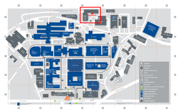 Das Institut für Physiologie finden Sie im 8. und 7. OG des Gebäudes "Institutsgruppe I" (IG I) am südlichen Rand des Klinikumsgeländes - auf dem Geländeplan das Gebäude in Planquadrat E1. Das Sekretariat des Instituts befindet sich im 8.OG, Bauteil C, Raum 4.
