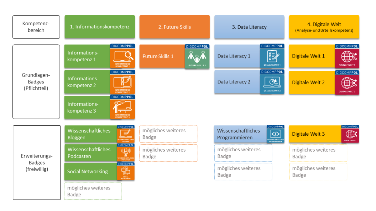 Das Zertifikat weist digitale Kompetenzen in vier Bereichen nach, die im Rahmen des Curriculum 4.0-Projekts definiert wurden. Studierende erwerben in diesen Kompetenzbereichen Badges, die als (nicht benotete, aber verpflichtende) Studienleistungen in bestehende Lehrveranstaltungen integriert sind. Neben den verpflichtenden Badges können Studierende freiwillig Erweiterungs-Badges sammeln. Die Architektur des Zertifikates ist für eine inhaltliche Weiterentwicklung und weitere Badges offen gestaltet, um neue Entwicklungen aufzugreifen.