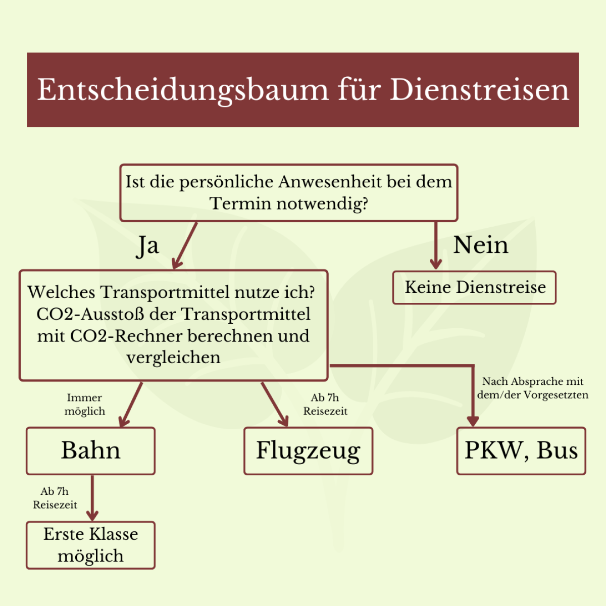 Als wichtigsten Bereich, in dem wir die Umweltauswirkungen unserer Arbeit senken können, sehen wir Dienstreisen an. Für diese folgen wird den im Entscheidungsbaum für Dienstreisen festgehaltenen Grundsätzen.