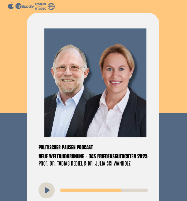 In einer neuen Folge des Politische Pausen Podcasts ist Prof. Dr. Tobias Debiel bei Dr. Julia Schwanholz zu Gast. Wie schon vor einem Jahr sprechen die beiden auch diesmal über das neue Friedensgutachten.