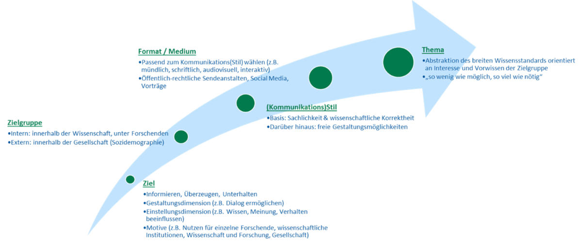 - Wirksame Kommunikation: Zentral ist für gute und wirksame Wissenschaftskommunikation die adäquate Wahl von Zielgruppe, Darstellung der Inhalte und kommunizierenden Personen (Impact Unit, Praxisrelevante Erkenntnisse einer systematischen Literaturanalyse wissenschaftlicher Publikationen von 2010-2020, Ergebnisbericht vom 30.09.2021, verfügbar unter: https://impactunit.de/wie-wirkt-wissenschaftskommunikation/). Inhaltlich kann Wissenschaftskommunikation so auf den nachfolgenden Ebenen gezielt wirken: Interesse an Wissenschaft und Forschung, wissenschaftliches Allgemeinwissen, themenbezogenes Faktenwissen zu Wissenschaft und Forschung, Bewertungen, Meinungen, Haltungen zu wissenschaftlichen Themen, Vertrauen in Wissenschaft und Forschung, Akzeptanz von Themen aus Wissenschaft und Forschung, Risikowahrnehmung („meint, inwiefern Menschen Wissenschaft oder ihre Erkenntnisse gesellschaftlich oder individuell als risikoreich wahrnehmen“), Verhaltensabsichten, Partizipation und Verhalten.