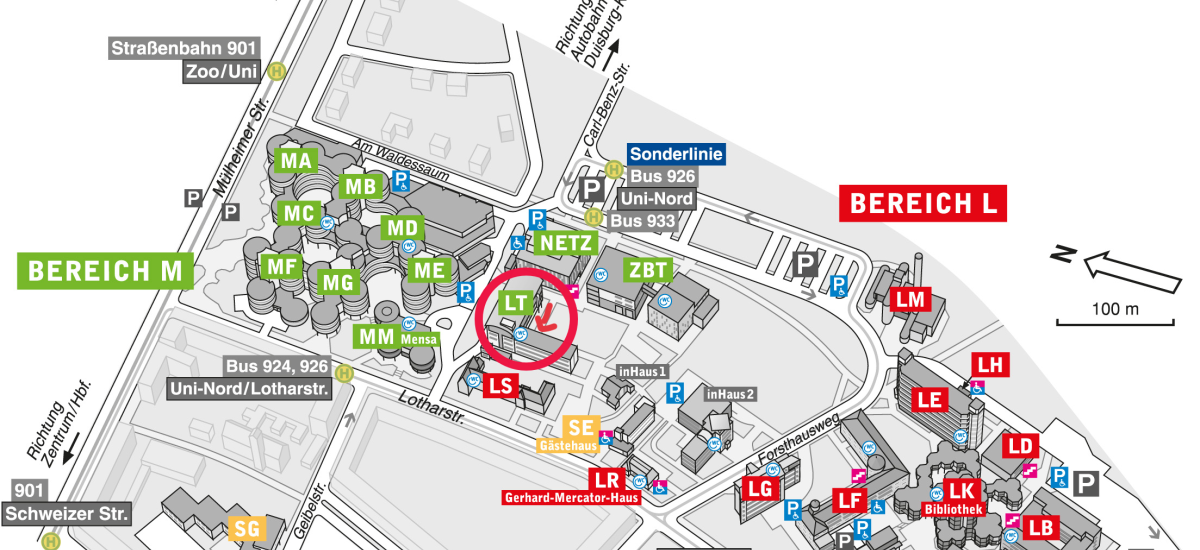 Besucher, die mit öffentlichen Verkehrsmitteln anreisen, können vom Duisburger Hauptbahnhof mit der Buslinie 933 (Richtung Uni Nord) bis zur Haltestelle „Uni-Nord/Lotharstr.“ fahren und von dort den Hinweisschildern zum NanoSchoolLab im Gebäude LT folgen.