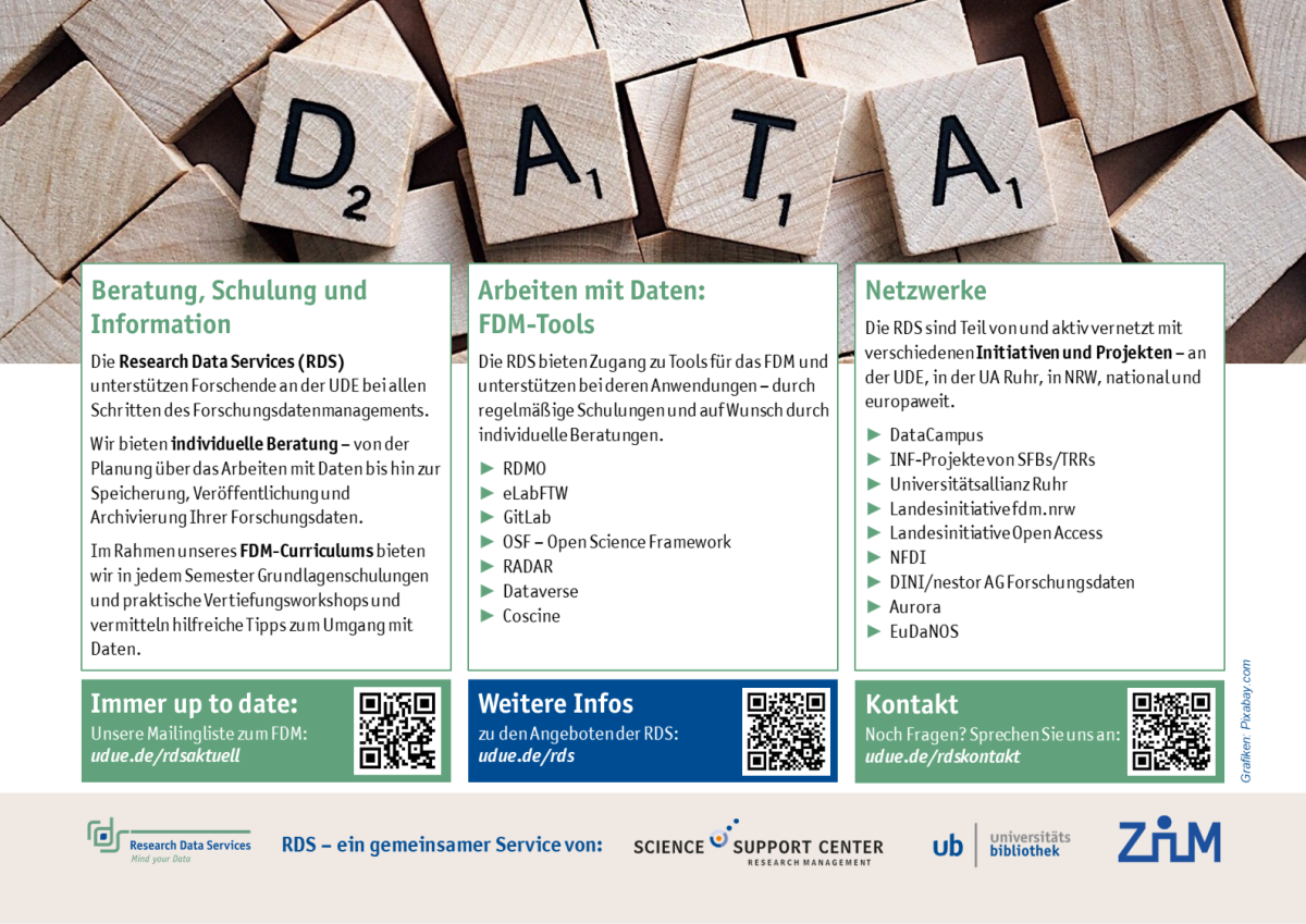 Über die Mailingliste RDS-aktuell informieren wir Sie zu aktuellen Themen, Veranstaltungen und Angeboten zum Forschungsdatenmanagement an der UDE.