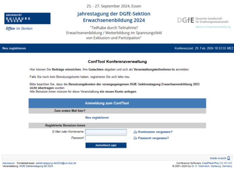 Ab dem 30. April 2024 können Sie sich über das Konferenzverwaltungssystem ConfTool für die Tagung anmelden. Dazu müssen Sie sich bitte ein Benutzerkonto anlegen. Die Konten von der letztjährigen Sektionstagung in München sind nicht mehr gültig! Wenn Sie ein Panel, einen Beitrag und/oder ein Poster für die Tagung einreichen, bedarf es dennoch der gesonderten Anmeldung für die Tagungsteilnahme, die Sie mit demselben Konto vornehmen. Bei technischen Problemen sowie weiteren Fragen rund um die Tagung schreiben Sie uns gerne: sektionstagung-eb2024@uni-due.de. Bitte haben Sie Verständnis, dass Anmeldungen via E-Mail nicht möglich sind.