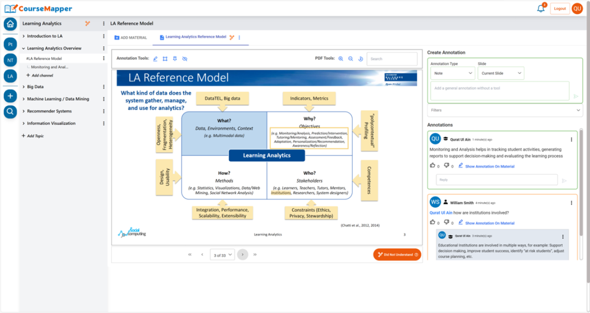 In each learning channel, learners can use different annotation tools (i.e., highlight, draw, pinpoint) to mark specific parts of the learning material and create different types of annotations (i.e., note, question, or external resource). They can also add annotations to a specific page of a PDF and for a specified time span on a video learning resource. These added annotations then appear in the discussion panel next to the learning material, categorized with different colors based on the annotation type.
