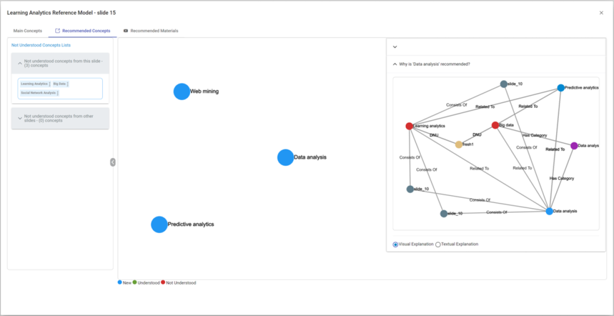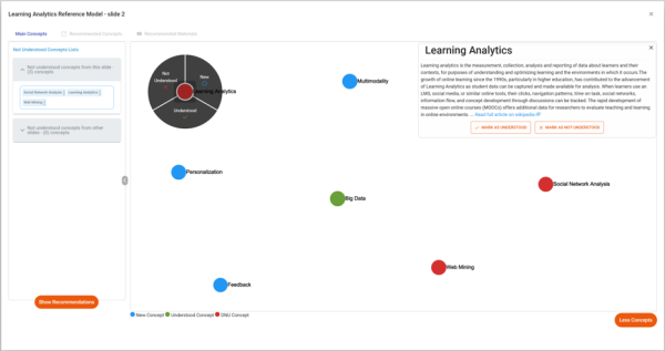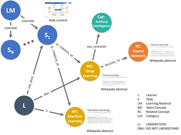 With every PDF learning material, there is a Did Not Understand (DNU) button at the bottom. When clicked, learners can see a local EduKG consisting of the top 5 main concepts extracted from the content of the current page. Learners can then mark the concept(s) they do not understand in this EduKG. In this way, they inform the system about their current knowledge state. This and other learners' interactions with the platform are used to build accurate learner models using Graph Neural Networks (GNNs).