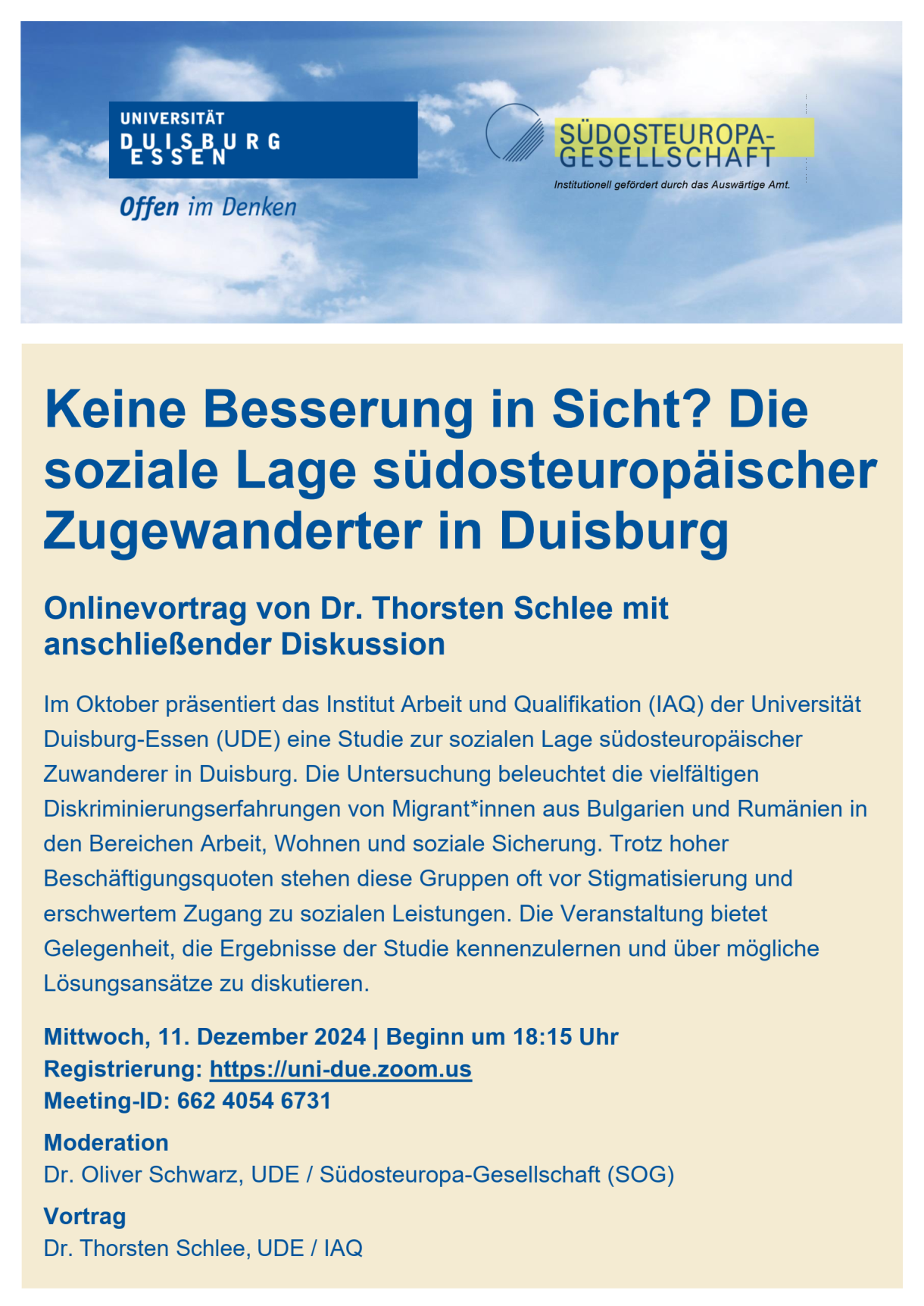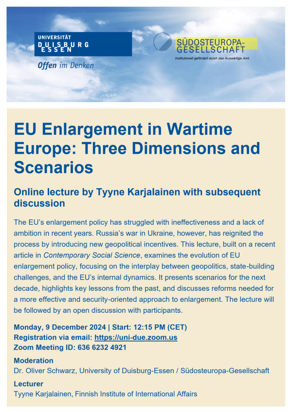 Am 4. Dezember hält Dr. Michael A. Rupp (GD ENEST, Europäische Kommission) einen Gastvortrag zum Thema "Aktuelle Entwicklungen in der EU-Erweiterungspolitik: Perspektiven aus der Europäischen Kommission". Die Veranstaltung findet vor Ort am Campus Duisburg in deutscher Sprache statt. Eine vorherige Anmeldung ist nicht erforderlich. Den Flyer zu der gemeinsamen Veranstaltung mit dem Institut für Politikwissenschaft finden Sie hier.