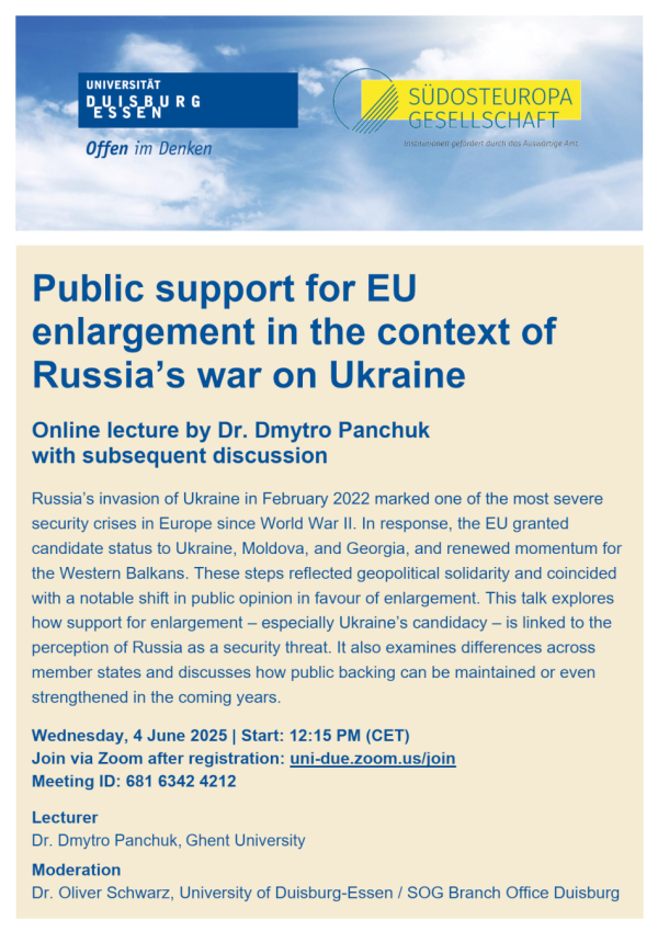 Am 4. Juni hält Dr. Dmytro Panchuk einen Gastvortrag zum Thema "Public support for EU enlargement in the context of Russia's war on Ukraine". Dmytro Panchuk ist Postdoktorand und Lehrender am am Department of Public Governance and Management der Universität Gent. Der Vortrag findet online über Zoom in englischer Sprache statt. Eine vorherige Anmeldung zur Teilnahme ist erforderlich. Den Flyer zu der gemeinsamen Veranstaltung mit dem Institut für Politikwissenschaft finden Sie hier.