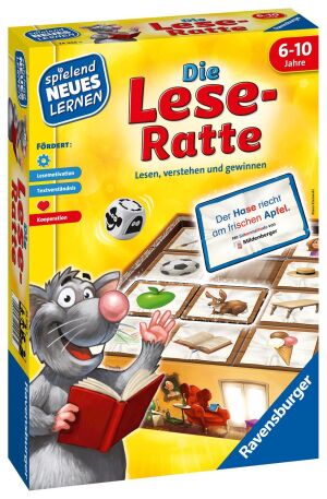 In dem Kinderspiel "Die Lese-Ratte" huscht eine Lese-Ratte durchs Bücherregal und knabbert alle Seiten an. Die ABC-Schützen müssen in diesem Lernspiel die Verfolgung des gierigen Nagetiers aufnehmen und lernen kinderleicht, wie das Lesen und Verstehen von Texten funktioniert. Um die gefräßige Lese-Ratte zu stoppen, müssen alle 1-4 Spieler zusammen verschiedene Aufgabenkarten lesen. Wenn sie den Text richtig verstanden haben, können sie die passenden Bilder auf dem Wende-Spielplan zusammenschieben. Das muss allerdings gelingen, bevor sich die Ratte durchs Regal genagt hat.