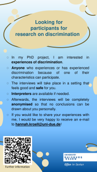 My name is Hannah Kröll (she/her) and I work as a doctoral research at the Institute of Sociology at the University of Duisburg-Essen. I have already investigated experiences of discrimination in my Bachelor's and Master's theses. In my research, it is important to me to make experiences visible that are less focused elsewhere.