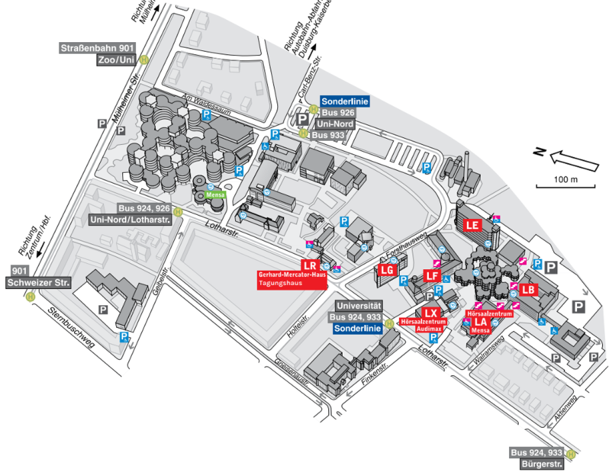 - Bus 924 Richtung Duisburg Sportpark bis zur Haltestelle „Universität“ oder „Uni-Nord / Lotharstraße“