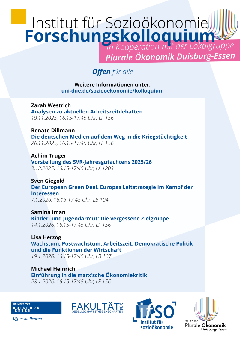 Das Forschungskolloquium im MA Sozioökonomie wird im Wintersemester 2025/26 von Achim Truger verantwortet und wird in Kooperation mit der Lokalgruppe Plurale Ökonomik Duisburg-Essen organisiert.