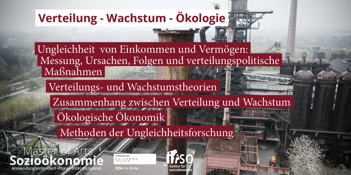 Die Lehrveranstaltung zielt darauf ab, Studierenden ein solides theoretisches, empirisches, institutionelles und politökonomisches Grundverständnis für Fragen der Verteilung von Einkommen und Vermögen sowie von ökologischen Dimensionen ökonomischer Zusammenhänge aus der Sicht unterschiedlicher wissenschaftlicher Paradigmen zu vermitteln. Ziel ist eine kritische Auseinandersetzung mit bestehenden wissenschaftlichen Ansätzen und empirischen Ergebnissen, um einen Überblick über das Thema zu erhalten und eine eigenständige Arbeit verfassen zu können. Die Studierenden sollen das Rüstzeug erhalten, um eigenständige wissenschaftliche Arbeiten zu den Modulthemen durchzuführen, von der Literaturrecherche über die Themendefinition bis zur empirischen Arbeit und dem Verfassen der Arbeit. Ein zentrales Ziel ist, dass die Studierenden nach Besuch der Lehrveranstaltung eine eigenständige, kritische Meinung zu den Modulthemen bilden können, und sie ein erweitertes Argumentarium für wirtschaftspolitische Debatten zu Verteilungsthemen und Ökologie – auch außerhalb des Schulungsraums – besitzen. Außerdem sollen sie Kenntnis relevanter Kennziffern und Größenordnungen behandelten Themenbereiche haben.
