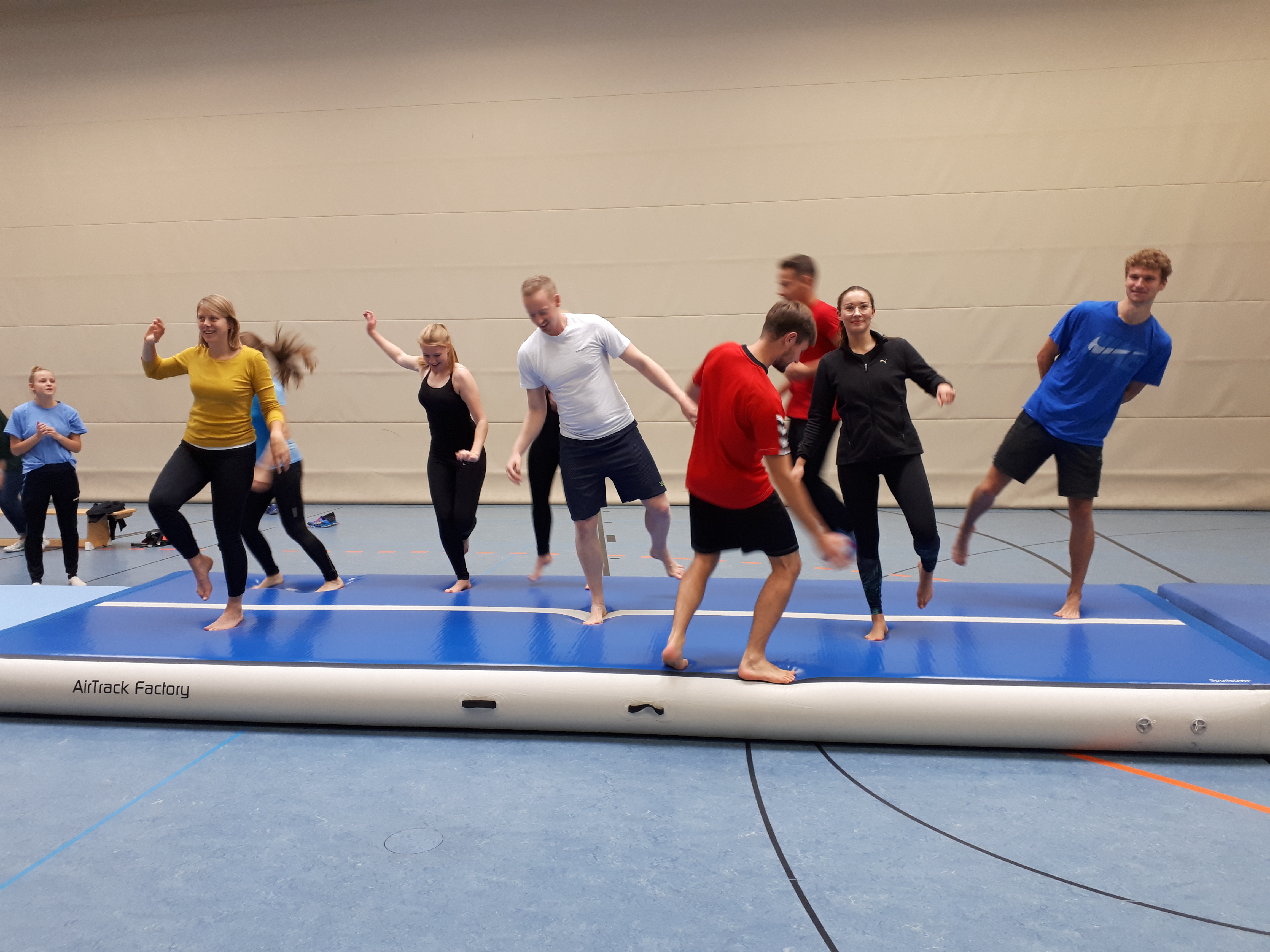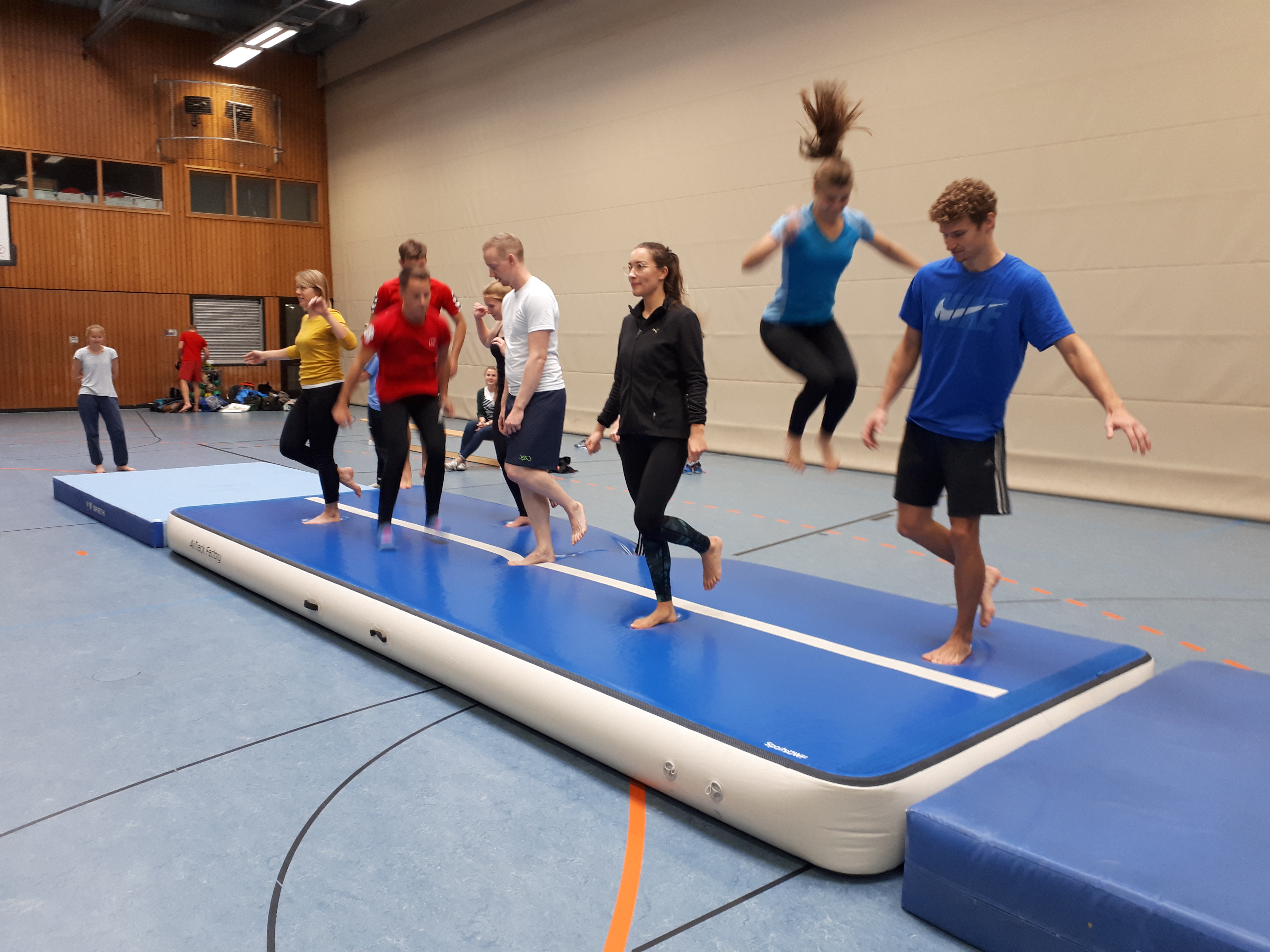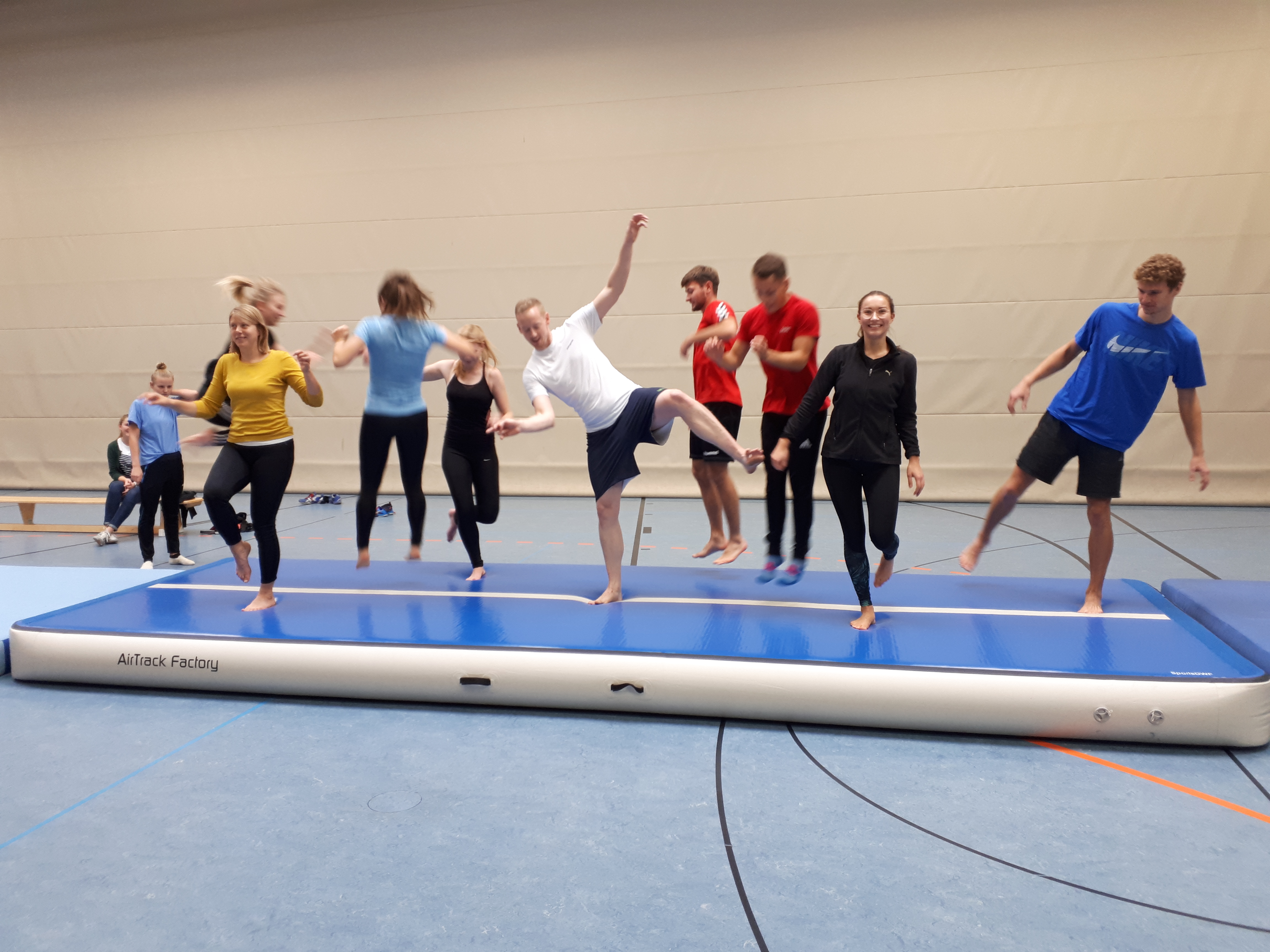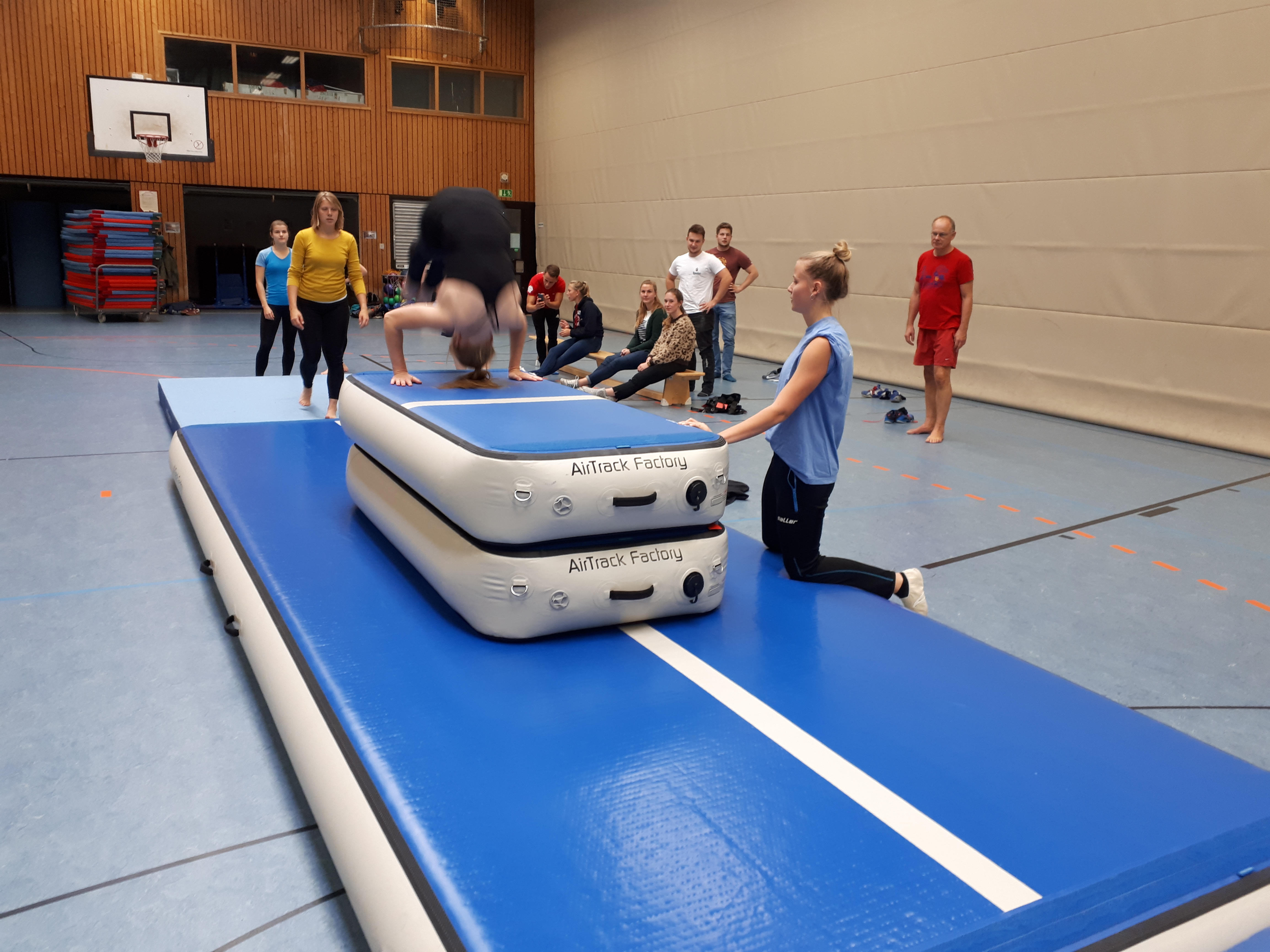 Am 10.10.2019 fand am Sportinstitut ein Workshop zu den Einsatzmöglichkeiten eines AirTracks statt. Das AirTrack ist ein luftgefülltes Kissen, welches vielfältig als methodische Lernhilfe für Kinder und Jugendliche eingesetzt werden kann. Die federnde Wirkung des Sportgerätes unterstützt das Abspringen, wodurch deutlich höhere Sprunghöhen erreicht werden können. Somit erleben sowohl Anfänger*innen als auch Fortgeschrittene schnell Erfolgserlebnisse und können sich auch an neuen Bewegungsformen erproben.