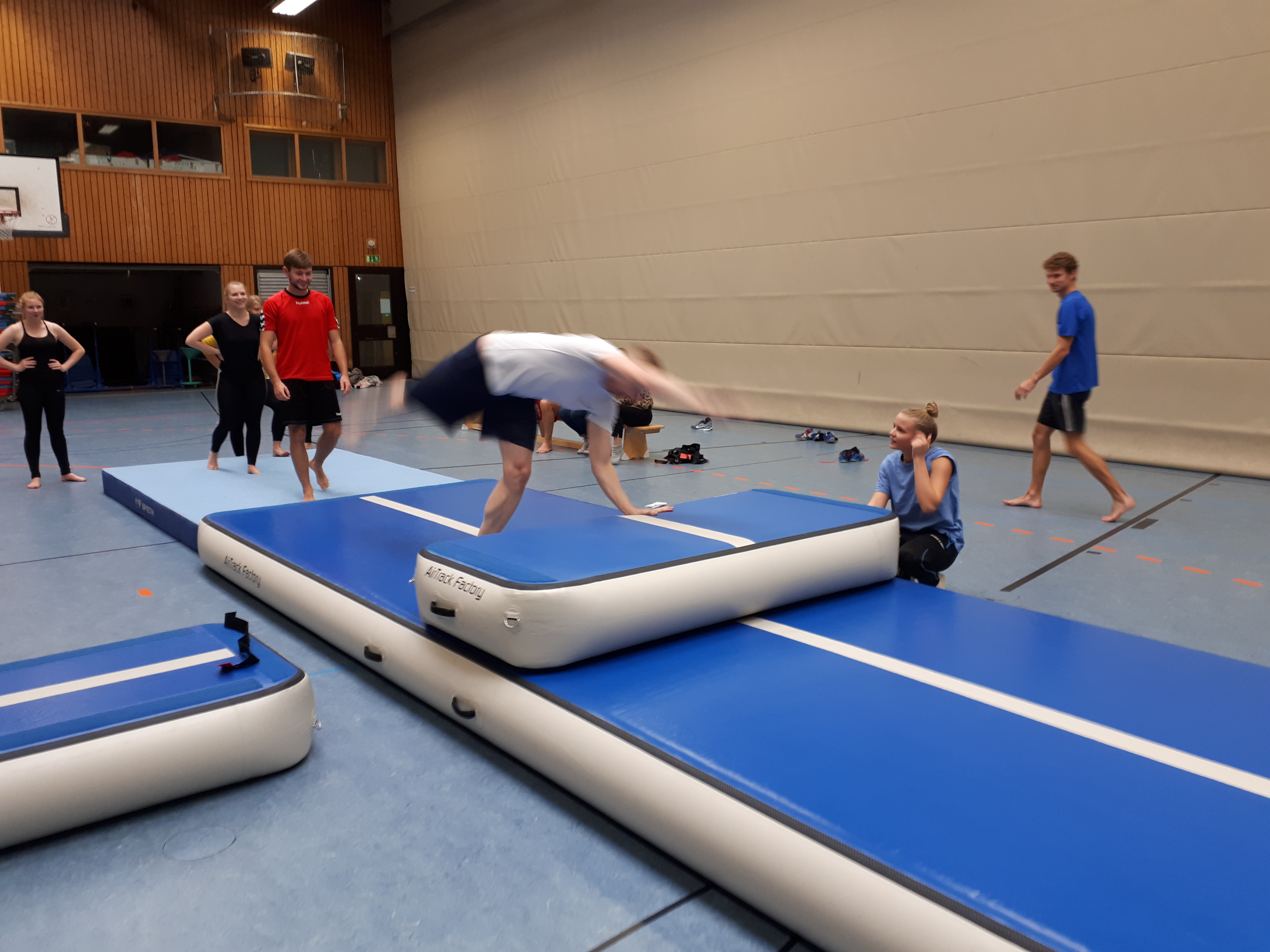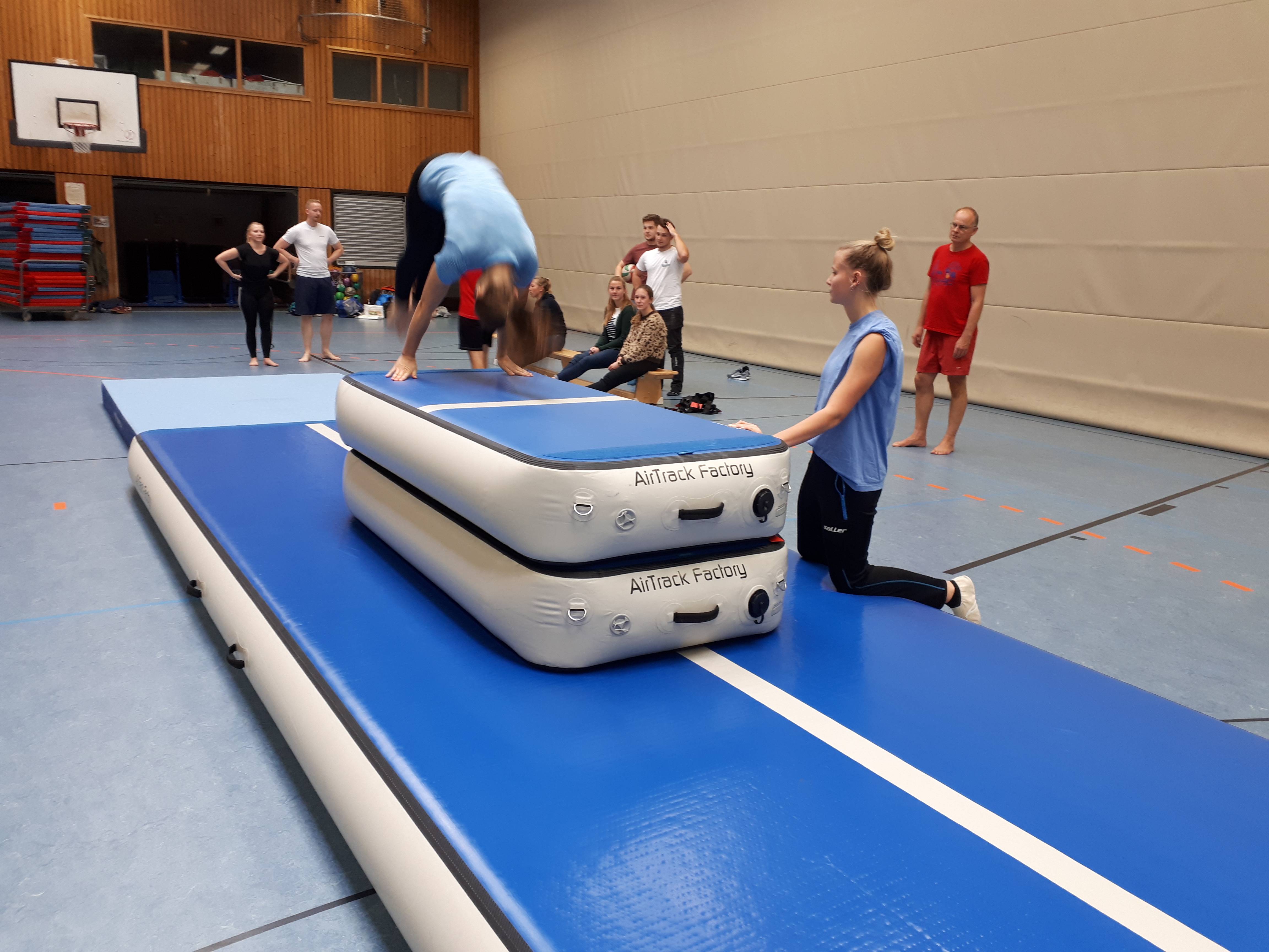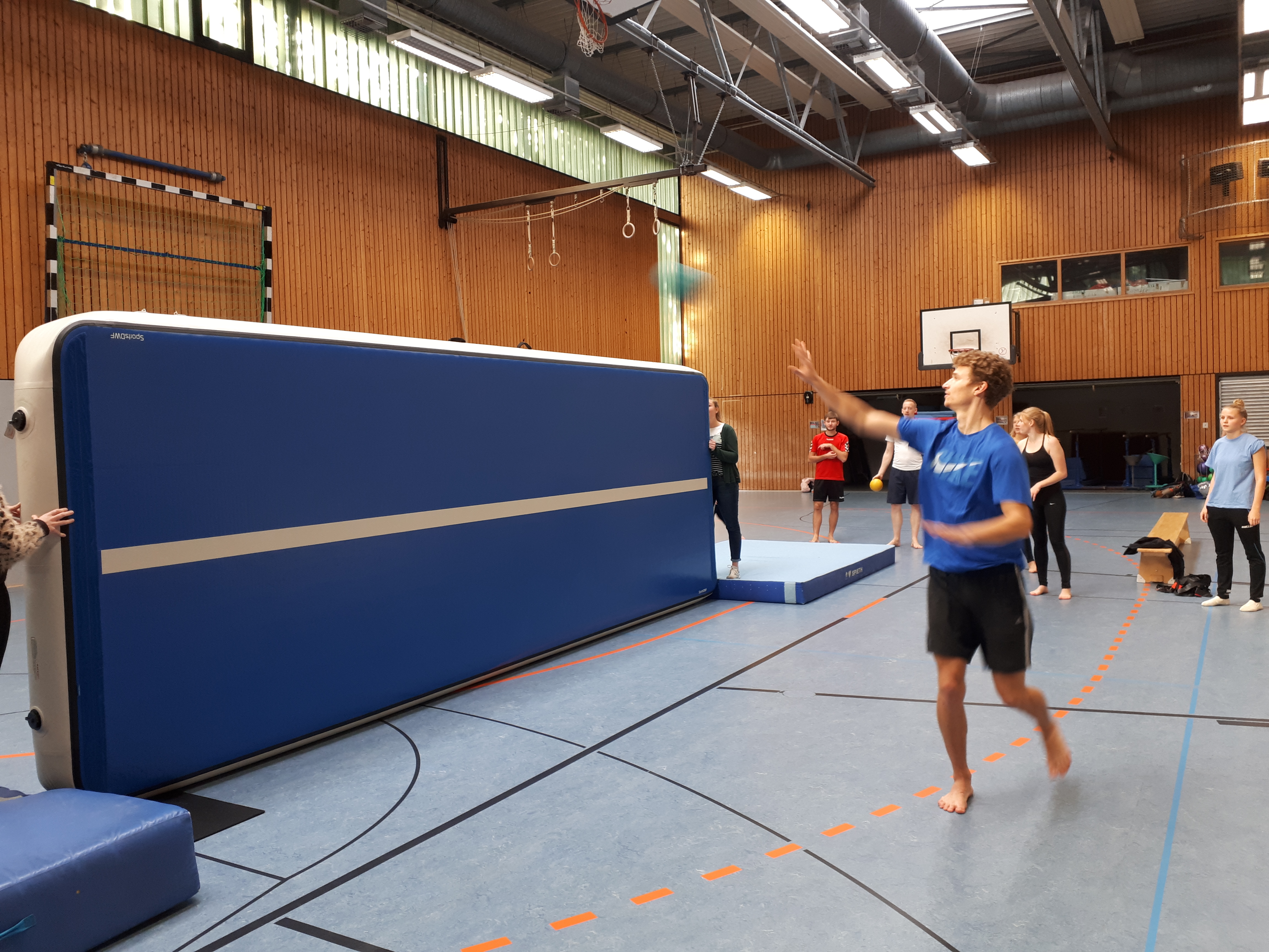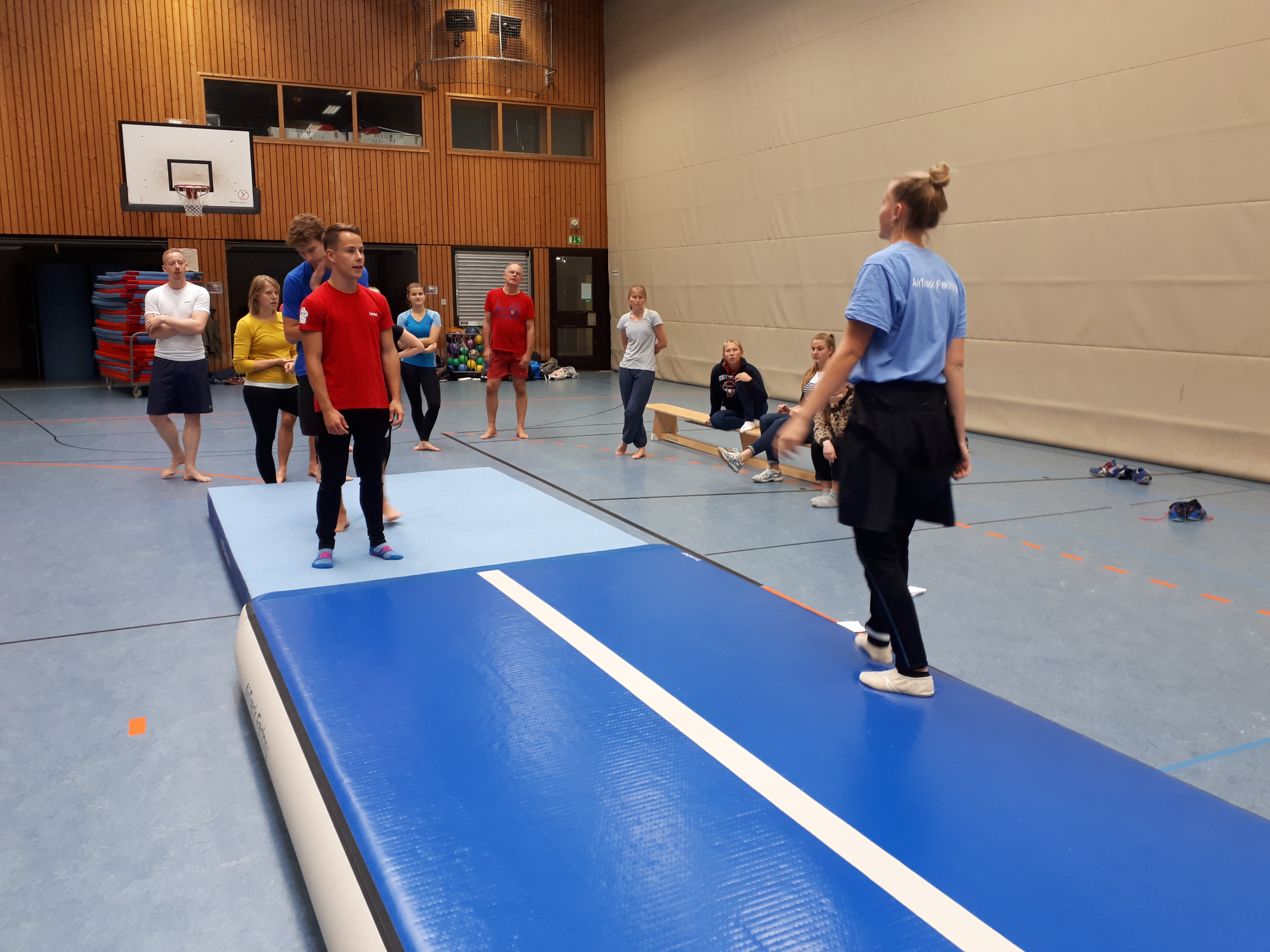 Am 10.10.2019 fand am Sportinstitut ein Workshop zu den Einsatzmöglichkeiten eines AirTracks statt. Das AirTrack ist ein luftgefülltes Kissen, welches vielfältig als methodische Lernhilfe für Kinder und Jugendliche eingesetzt werden kann. Die federnde Wirkung des Sportgerätes unterstützt das Abspringen, wodurch deutlich höhere Sprunghöhen erreicht werden können. Somit erleben sowohl Anfänger*innen als auch Fortgeschrittene schnell Erfolgserlebnisse und können sich auch an neuen Bewegungsformen erproben.