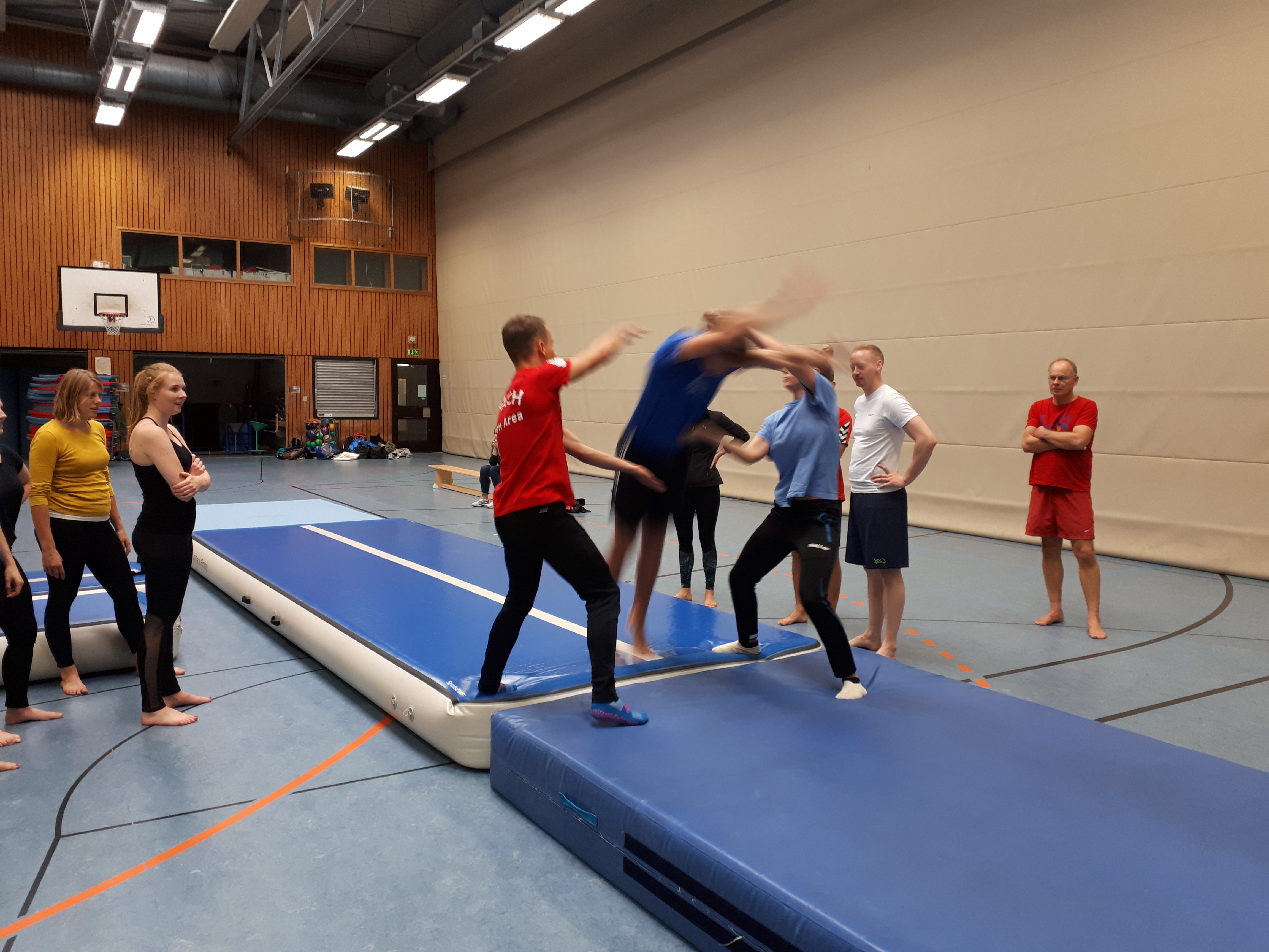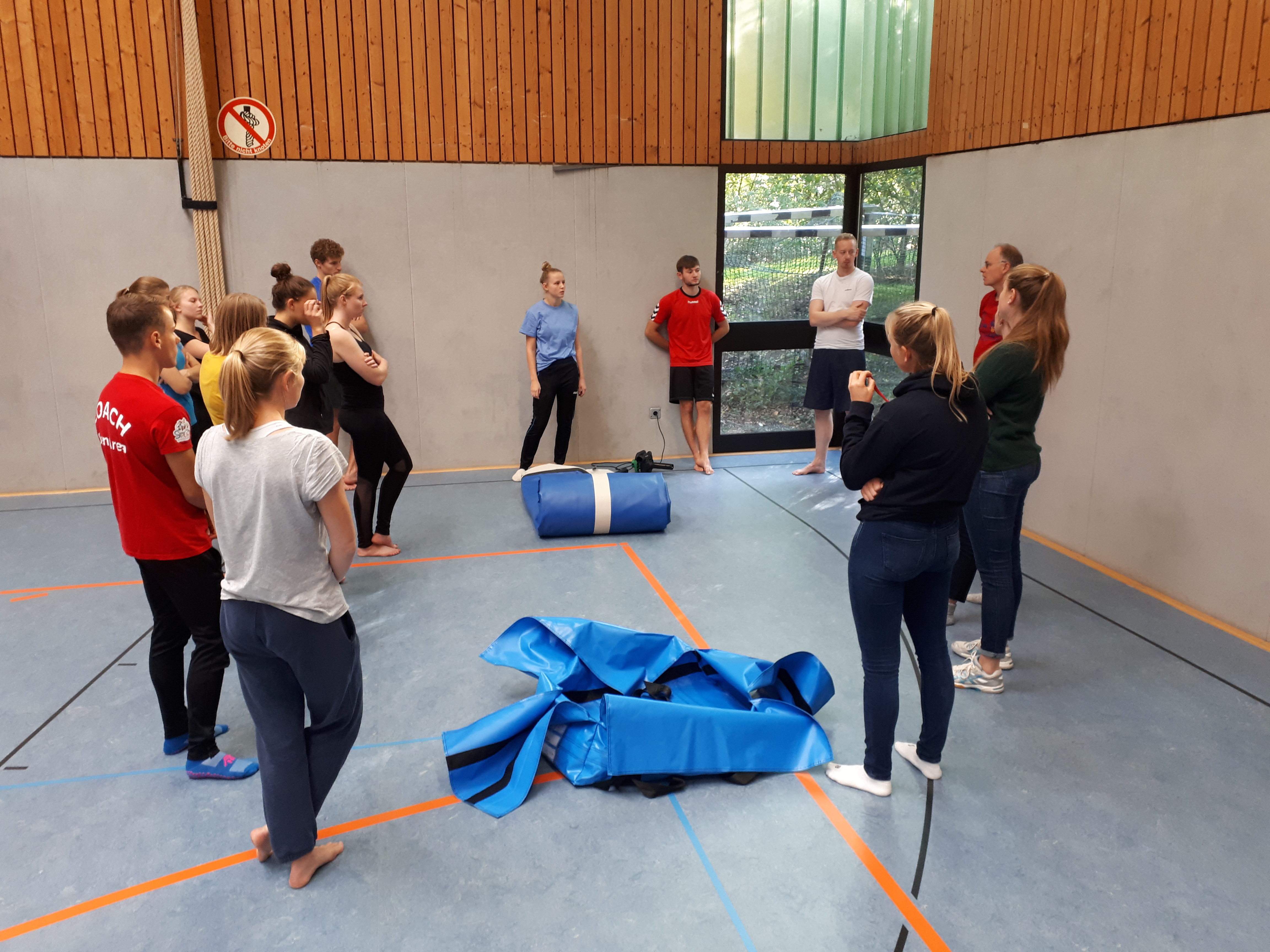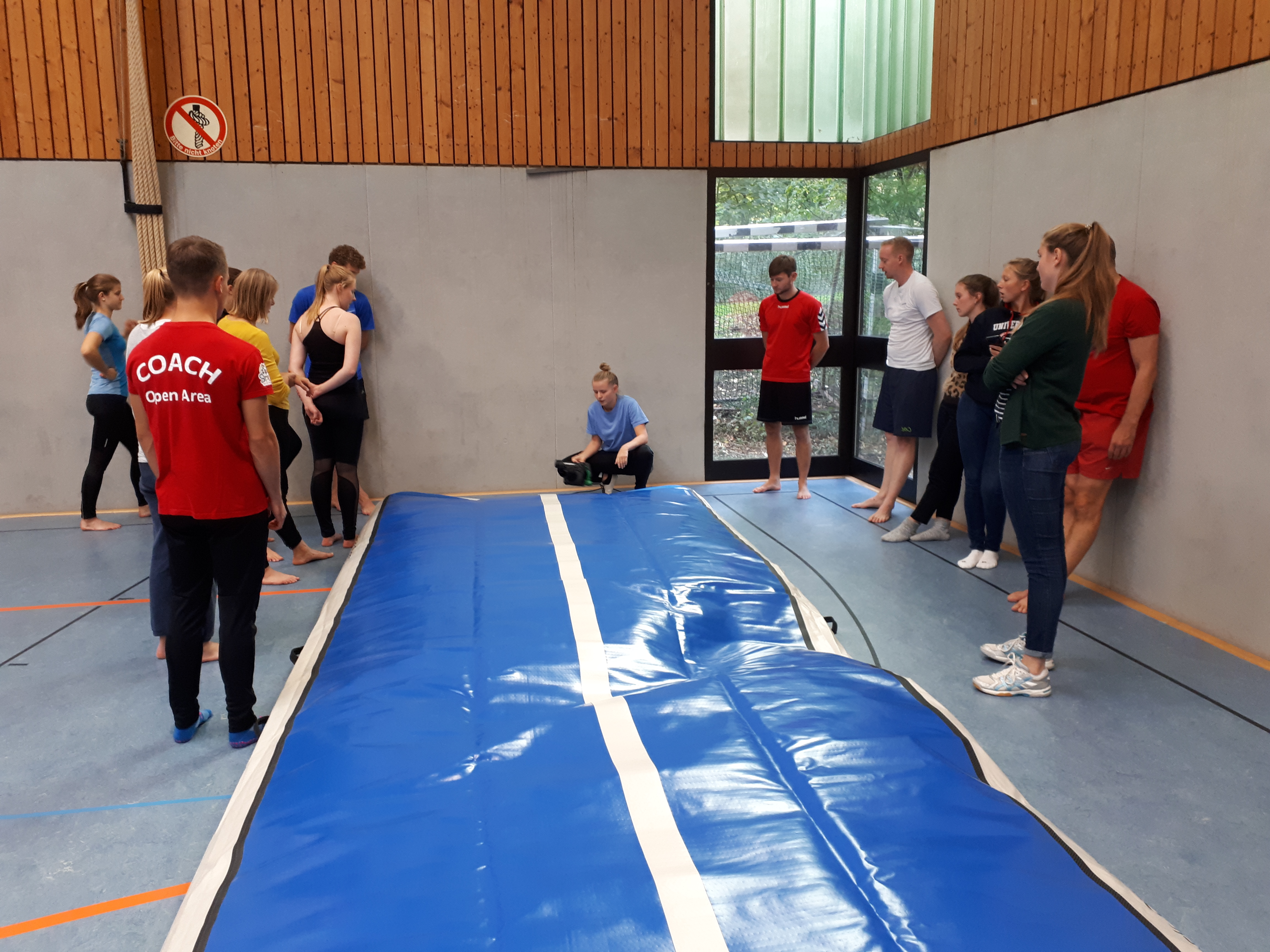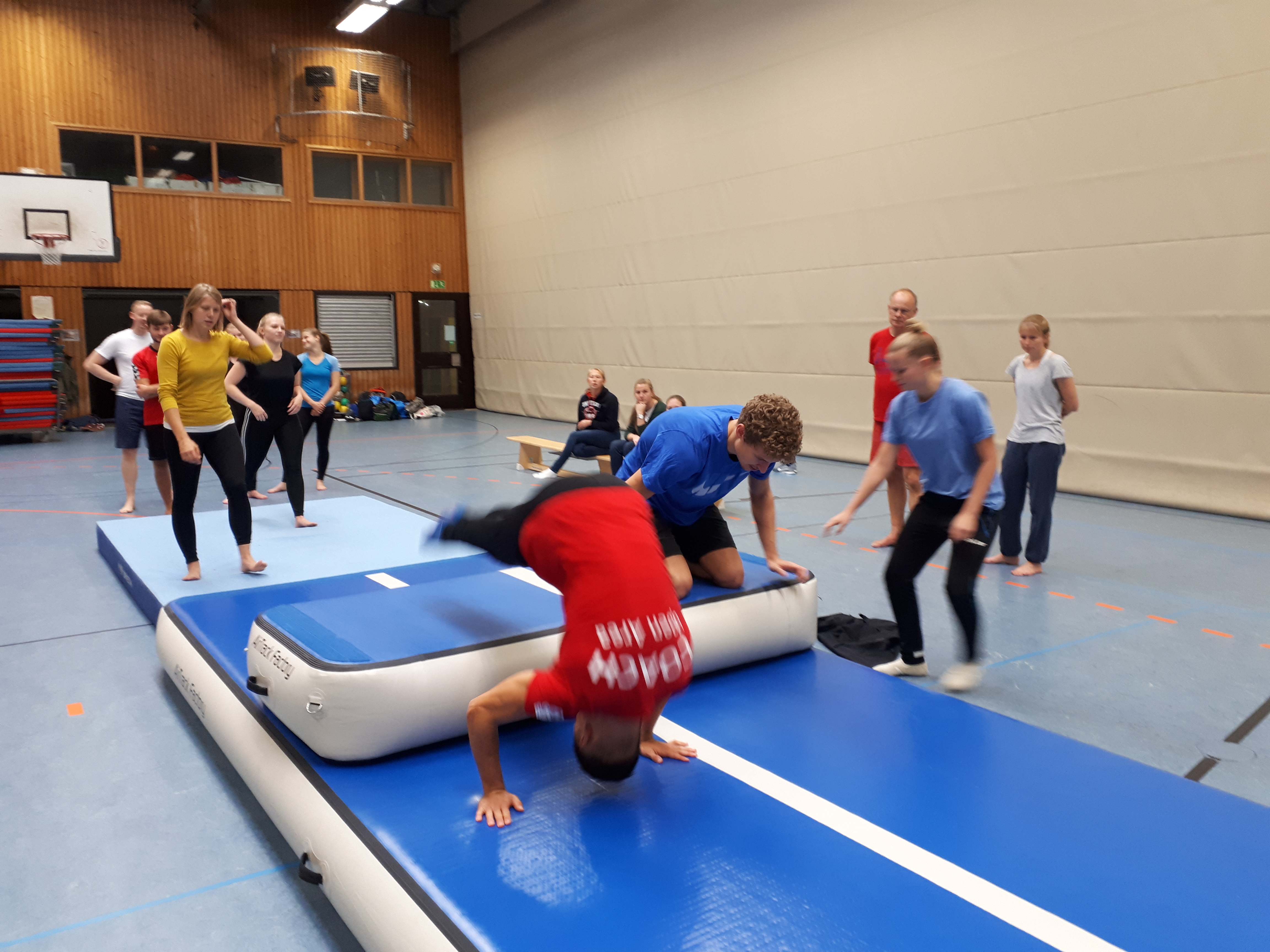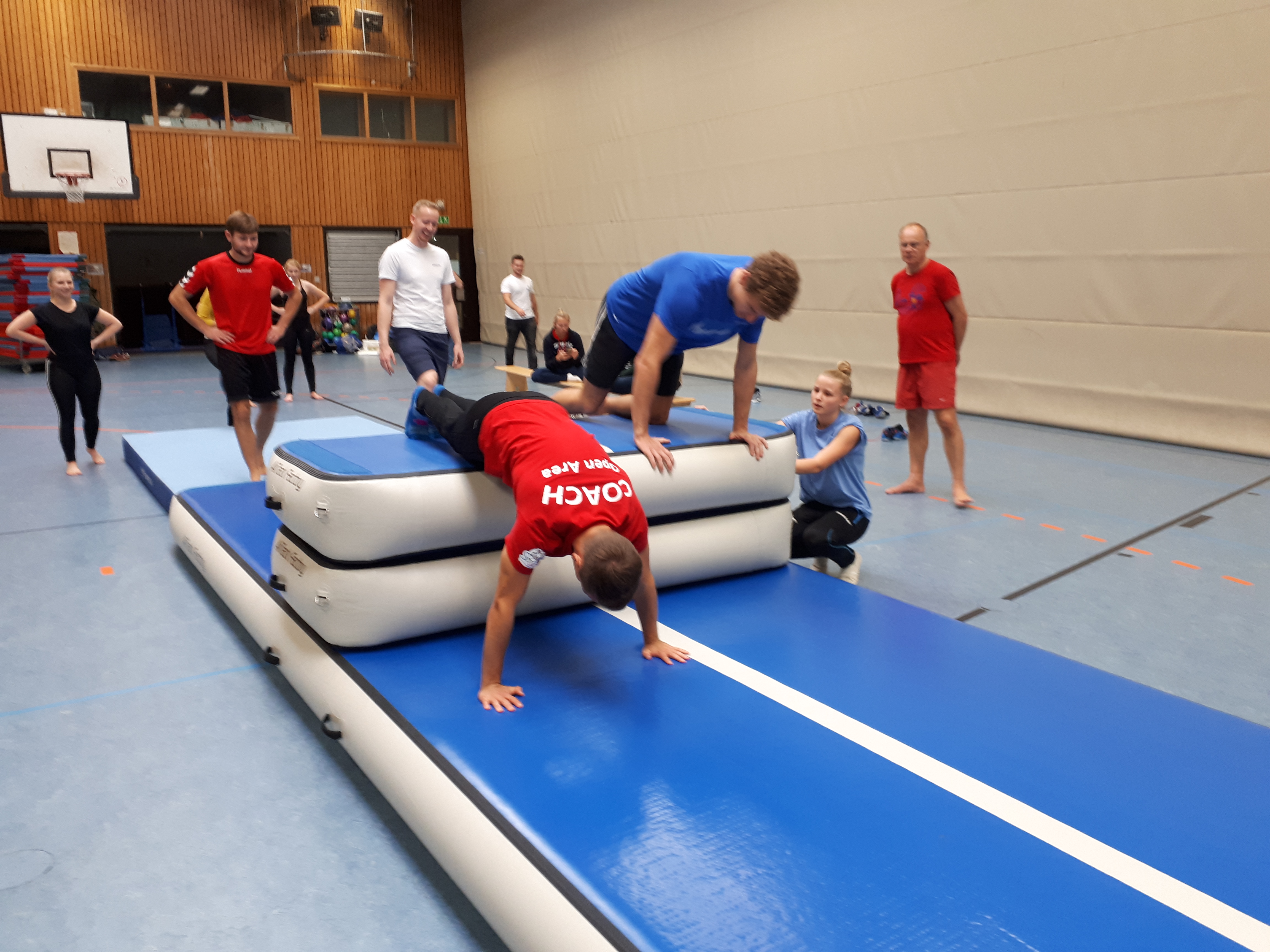 Am 10.10.2019 fand am Sportinstitut ein Workshop zu den Einsatzmöglichkeiten eines AirTracks statt. Das AirTrack ist ein luftgefülltes Kissen, welches vielfältig als methodische Lernhilfe für Kinder und Jugendliche eingesetzt werden kann. Die federnde Wirkung des Sportgerätes unterstützt das Abspringen, wodurch deutlich höhere Sprunghöhen erreicht werden können. Somit erleben sowohl Anfänger*innen als auch Fortgeschrittene schnell Erfolgserlebnisse und können sich auch an neuen Bewegungsformen erproben.