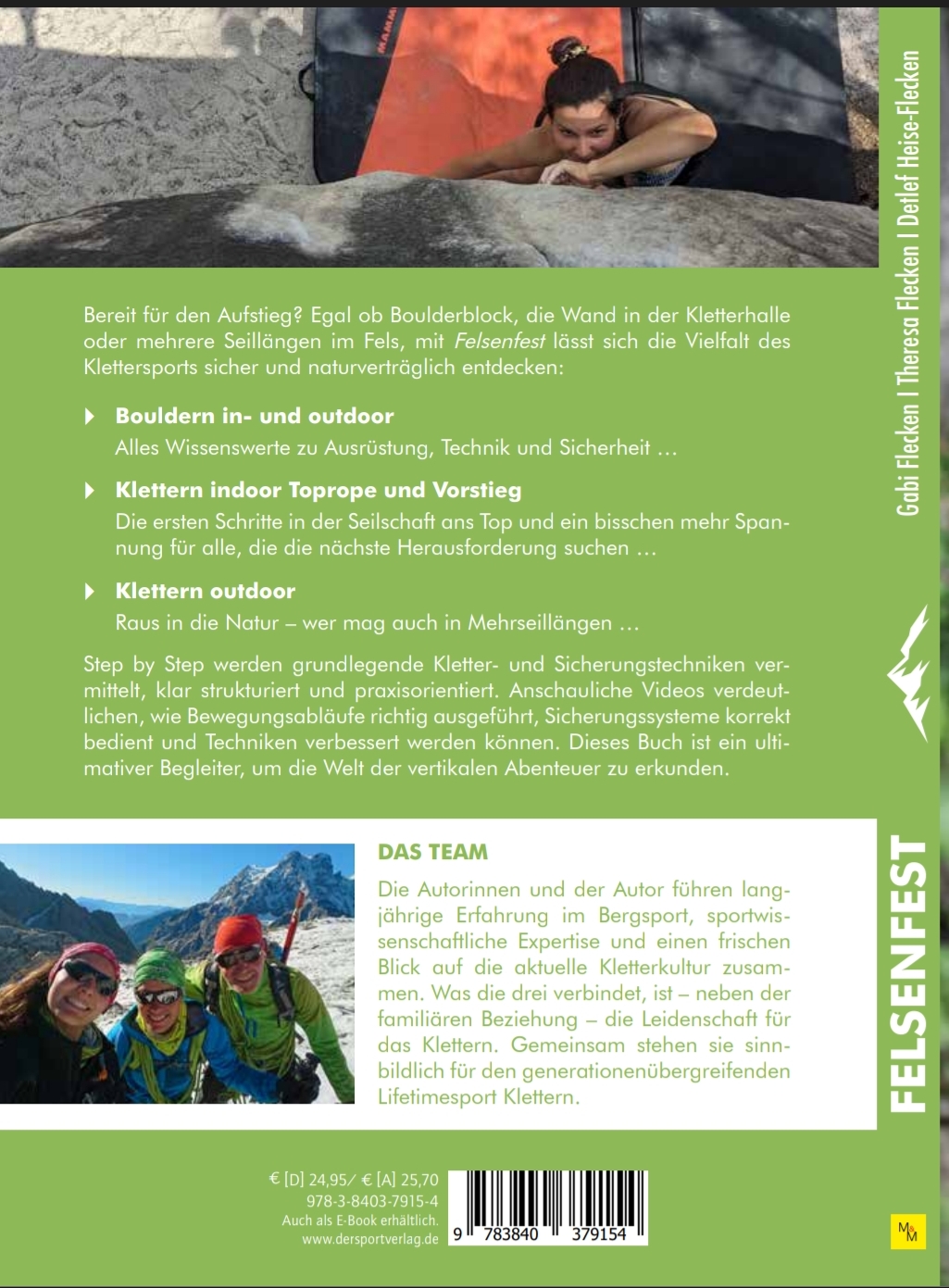 Mit Felsenfest haben Gabi Flecken, Theresa Flecken und Detlef Heise-Flecken ein praxisnahes, klar strukturiertes Handbuch zu unterschiedlichen Facetten des Kletterns vorgelegt. Wie Yannick Flohé in seinem Vorwort schreibt "Da ist für alle etwas dabei." Anschauliche Videos verdeutlichen, wie Bewegungsabläufe richtig ausgeführt, Sicherungssysteme korrekt bedient und Techniken verbessert werden können.