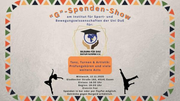Zu sehen sind Prüfungsküren von Studierenden im Modul G, Darbietungen der Tanz- und Turntutor:innen und externe Acts. Alle Spenden gehen an den Verein "Bildung für das Bistum Njombe" der mit dem Bau von Schulen in Tansania Kindern und Jugendlichen Chancen auf Bildung ermöglicht und damit Zukunftsperspektiven eröffnet. Wir freuen uns auf Euer/Ihr Kommen!