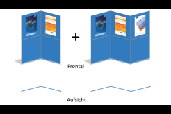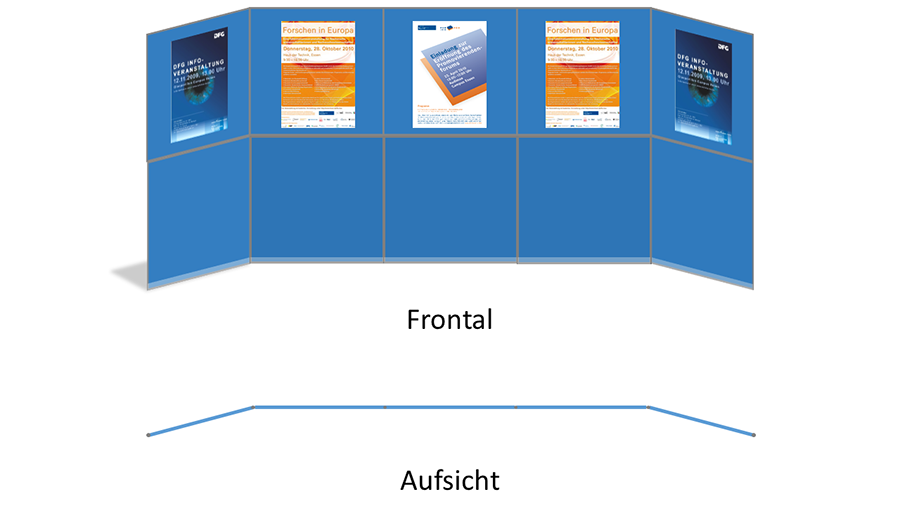 Hierbei besteht eine Posterwand aus mindestens 4 Paneelen und 3 Verbindungsstangen.