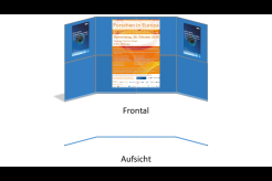 Auf die Möglichkeit der doppelseitigen Nutzung Posterwand-Systems CLIP sei hier explizit hingewiesen. Darüber hinaus existieren die verschiedensten Elemente dieses Systems wie z. B. Podeste und eine Theke.