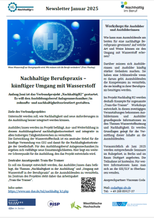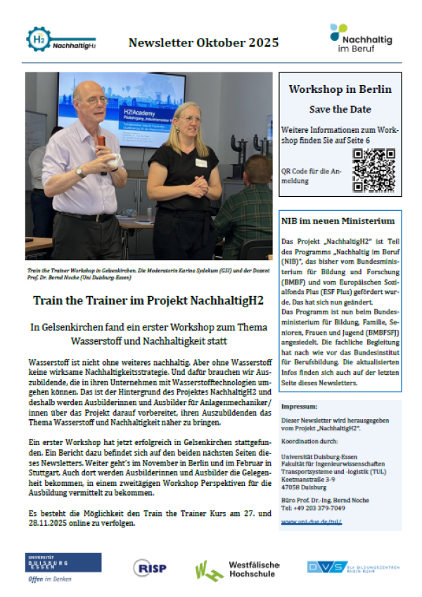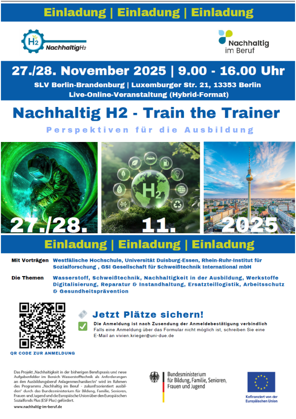 Das Kooperationsprojekt " NachhaltigH2“ wurde Anfang Juni gestartet. Ziel ist es, die berufliche Ausbildung von Anlagenmechanikerinnen und Anlagenmechanikern zukunftsorientiert und nachhaltig auszurichten. Das Projekt soll Ausbilderinnen und Ausbilder dazu befähigen, die Ausbildung und Weiterbildung in diesem Beruf ganzheitlich und nachhaltig zu gestalten – unter Berücksichtigung aller bestehenden Tätigkeitsfelder. Die Entwicklung der Wasserstofftechnologie ist ein zentraler Hebel zur zukünftigen CO₂-Reduktion und damit ein wichtiger Bestandteil der gesellschaftlichen Nachhaltigkeitsstrategie. Dadurch entstehen vielfältige neue berufliche Perspektiven für Anlagenmechanikerinnen und Anlagenmechaniker, die künftig einen weiteren Schwerpunkt der Ausbildung bilden sollen. Das Projekt untersucht, wie Nachhaltigkeit und neue Anforderungen besser in die berufliche Ausbildung integriert werden können. Hierfür wird ein Konzept entwickelt, das Ausbilderinnen und Ausbilder darin unterstützt, diese Inhalte effektiv an ihre Auszubildenden zu vermitteln. Kern des Projekts ist deshalb das Arbeitspaket "Train the Trainer“. Das Projekt wird von einem interdisziplinären Team aus verschiedenen wissenschaftlichen Disziplinen sowie Fachkräften der beruflichen Bildung durchgeführt. Der zentrale Projektstandort für Entwicklung, Erprobung und Transfer der Ergebnisse ist die GSI – Gesellschaft für Schweißtechnik International mbH in Oberhausen. Antragstellende Partner sind die Ingenieurwissenschaften der Universität Duisburg-Essen, die Westfälische Hochschule in Gelsenkirchen sowie das Rhein-Ruhr-Institut für Sozialforschung und Politikberatung (RISP) in Duisburg. Das zweijährige Projekt wird mit über 1 Million Euro vom Bundesministerium für Familie, Senioren, Frauen und Jugend (BMFSFJ) und der EU im Rahmen des Programms "Nachhaltig im Betrieb (NIB)“ gefördert. |