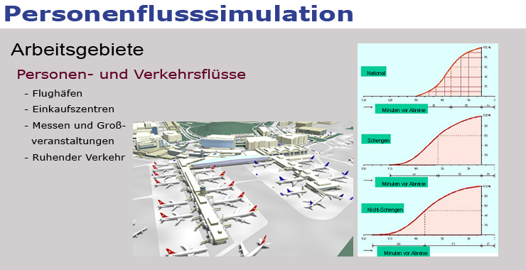 In der Abbildung ist das Arbeitsgebiet Personen- und Verkehrsflüsse dargestellt, folgende Schwerpunkte sind aufgeführt: Flughäfen, Einkaufszentren, Messen und Großveranstaltungen und Ruhender Verkehr, ergänzend sind noch zwei Bilder eingebunden ein Flughafenterminal und ein Diagramm