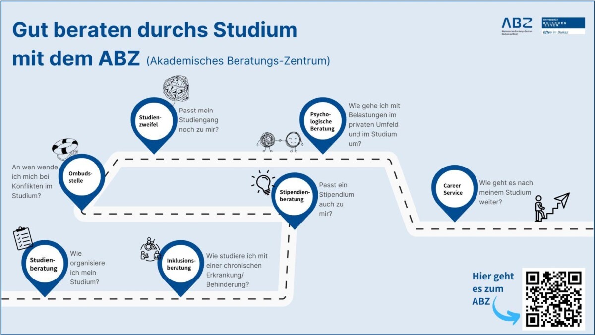 Für weitere Beratungsstellen und Angebote besuchen Sie bitte die Website des Allgemeinen Beratungszentrums (ABZ) der UDE. Dort finden Sie umfassende Informationen und Kontaktdaten.