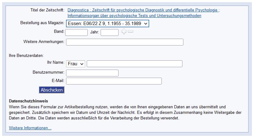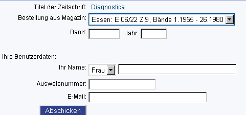Titel und Signatur der ausgewählten Zeitschrift werden in das Bestellformular übertragen: