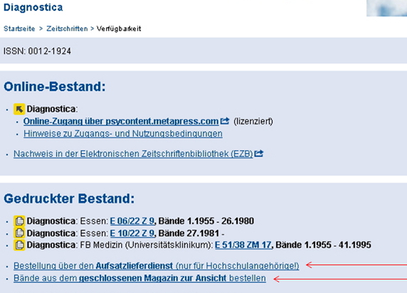 Rufen Sie unseren Katalog Primo auf und geben Sie den Titel der gesuchten Zeitschrift ein, z.B. "Diagnostica":