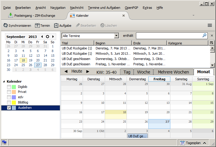 Ausleihen, die am gleichen Tag fällig sind, werden zu einem Eintrag im Kalender gruppiert. Für jedes Rückgabedatum enthält der Titel des Termins die Anzahl der fälligen Exemplare, z. B. "UB DuE Rückgabe (2)". In der Detailanzeige werden dann alle Exemplare mit Standort, Signatur, Titel und Autor aufgelistet.