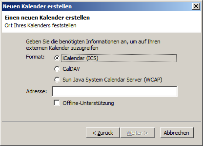 Stellen Sie sicher, dass "iCalendar (ICS)" markiert ist und fügen Sie mit der Tastenkombination "Strg+V" die eben kopierte URL Ihrer *.ics-Datei aus Primo ein.
