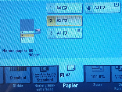 Optional: Druckeinstellungen ändern (z.B. doppelseitiger Druck) - blauen Knopf betätigen und so den Druckvorgang starten