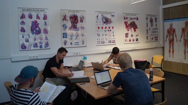 - einen Gruppenarbeitsraum mit Monitor und Whiteboard