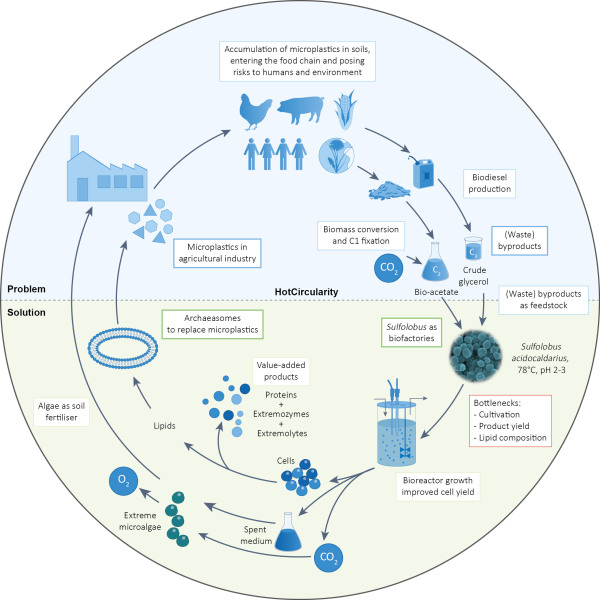 Zusammenfassung. Mikroplastik ist in der Landwirtschaft weit verbreitet, aber schädlich für die Umwelt und die menschliche Gesundheit, sodass umweltfreundliche Ersatzstoffe dringend benötigt werden. Produkte auf der Grundlage von Tetraetherlipiden (TEL), die von Mikroben wie Sulfolobus acidocaldarius (Saci) hergestellt werden, sind vielversprechende Alternativen zu Mikroplastik, aber ihre Verwendung wird derzeit durch einen Mangel an optimierten Mikroben und effizienten Verfahren, die die Herstellung dieser Materialien kostengünstig und zuverlässig machen können, eingeschränkt. Wir schlagen eine einzigartige Zusammenarbeit zwischen Mikrobiologen, Bioverfahrenstechnikern und der Industrie vor, um Saci zu einer einzigartigen Biofabrik zu entwickeln, die auf billigen Abfallprodukten wachsen kann, und TEL-basierte Produkte als neuartige und sehr wertvolle Alternativen zu Mikroplastik in der Landwirtschaft zu entwickeln. Dieser Ansatz wird die Kreislaufwirtschaft unterstützen, indem er Abfälle reduziert und biologisch abbaubare Produkte anbietet, die Umweltschadstoffe ersetzen.