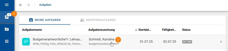 Wenn eine Aufgabe von Ihnen freigegeben werden muss, erhalten Sie am nächsten Tag eine E-Mail mit der Information, dass eine fällige Aufgabe vorliegt. Über den Link in der E-Mail gelangen Sie derzeit in die Vorgangsübersicht. Für eine bessere Bearbeitung ist es ratsam, in die Aufgabenansicht zu wechseln. Dafür klicken Sie im Menü auf „Aufgaben“ (Nr. 1 im u.a. Screenshot) und wählen die Aufgabe, die Sie bearbeiten möchten (Nr. 2 im u.a. Screenshot). Für die nahe Zukunft ist vorgesehen, dass der Link in der E-Mail Sie direkt in die zu bearbeitende Aufgabe führt.