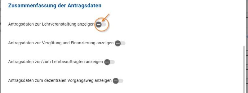 Von Ihrer Rolle unabhängig finden Sie zum Ende der Aufgabe stets eine Zusammenfassung der Antragsdaten. Wenn Sie die Schieberegler aktivieren, erhalten Sie jeweils detaillierte Informationen zum Lehrauftrag